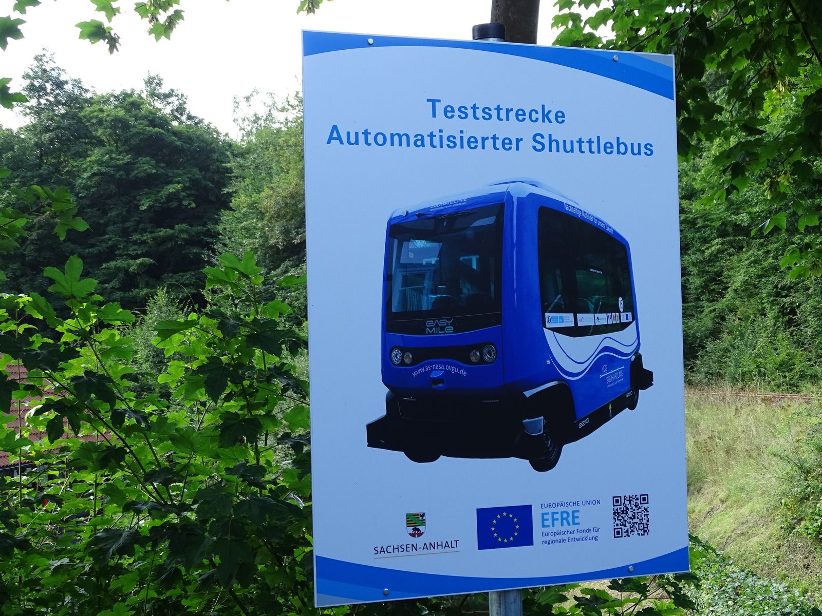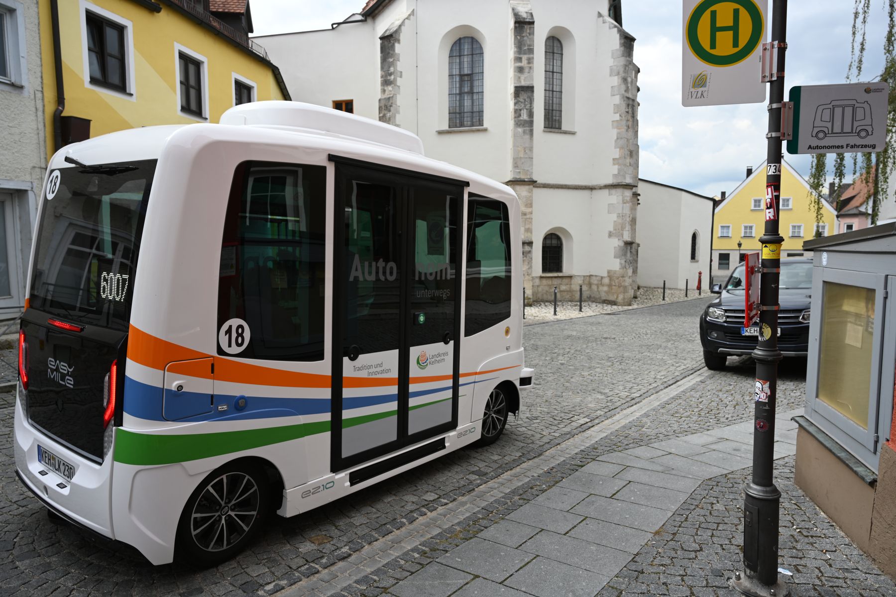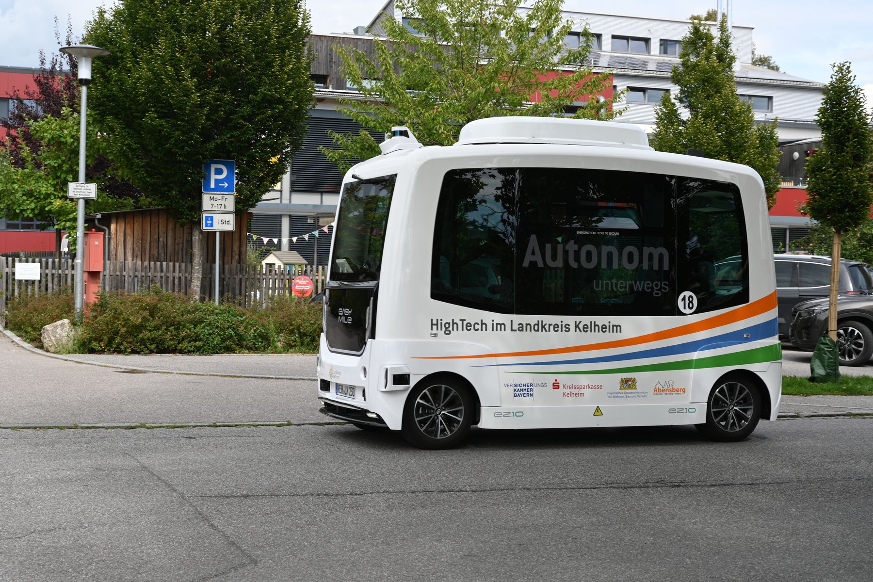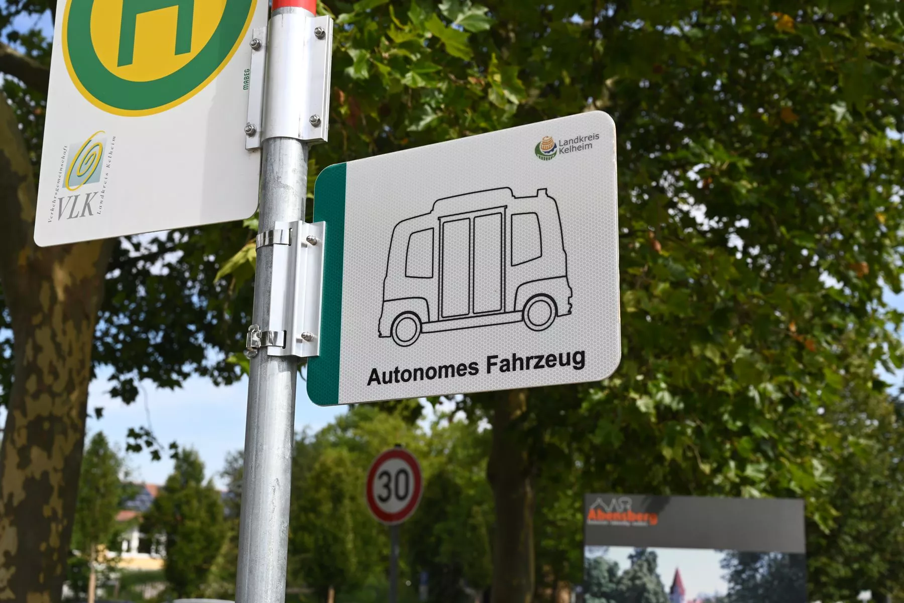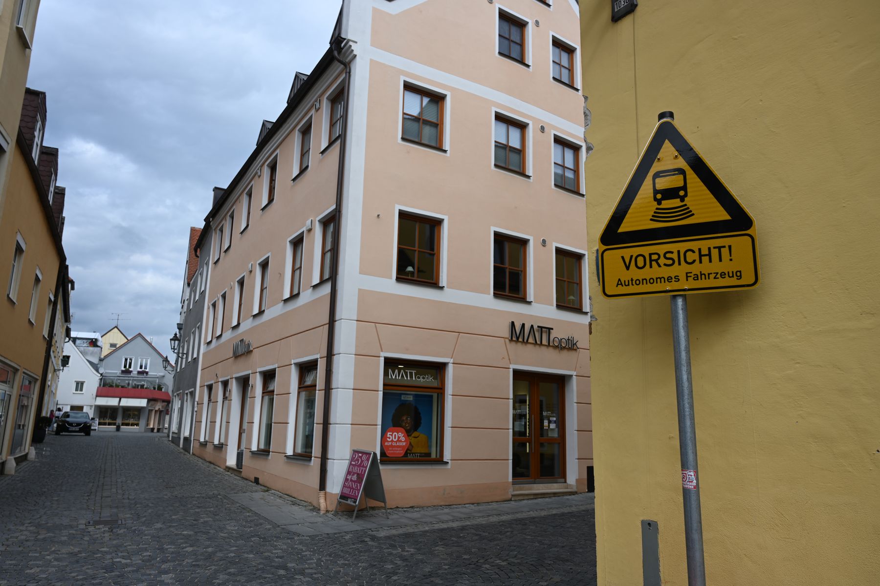 Aber das Thema dieses Beitrags heißt "autonomes Fahren". Und genau das erlebten wir ebenfalls in Abensberg. Auf der Suche nach dem Hundertwasser-Turm sahen wir zunächst dieses Schild: