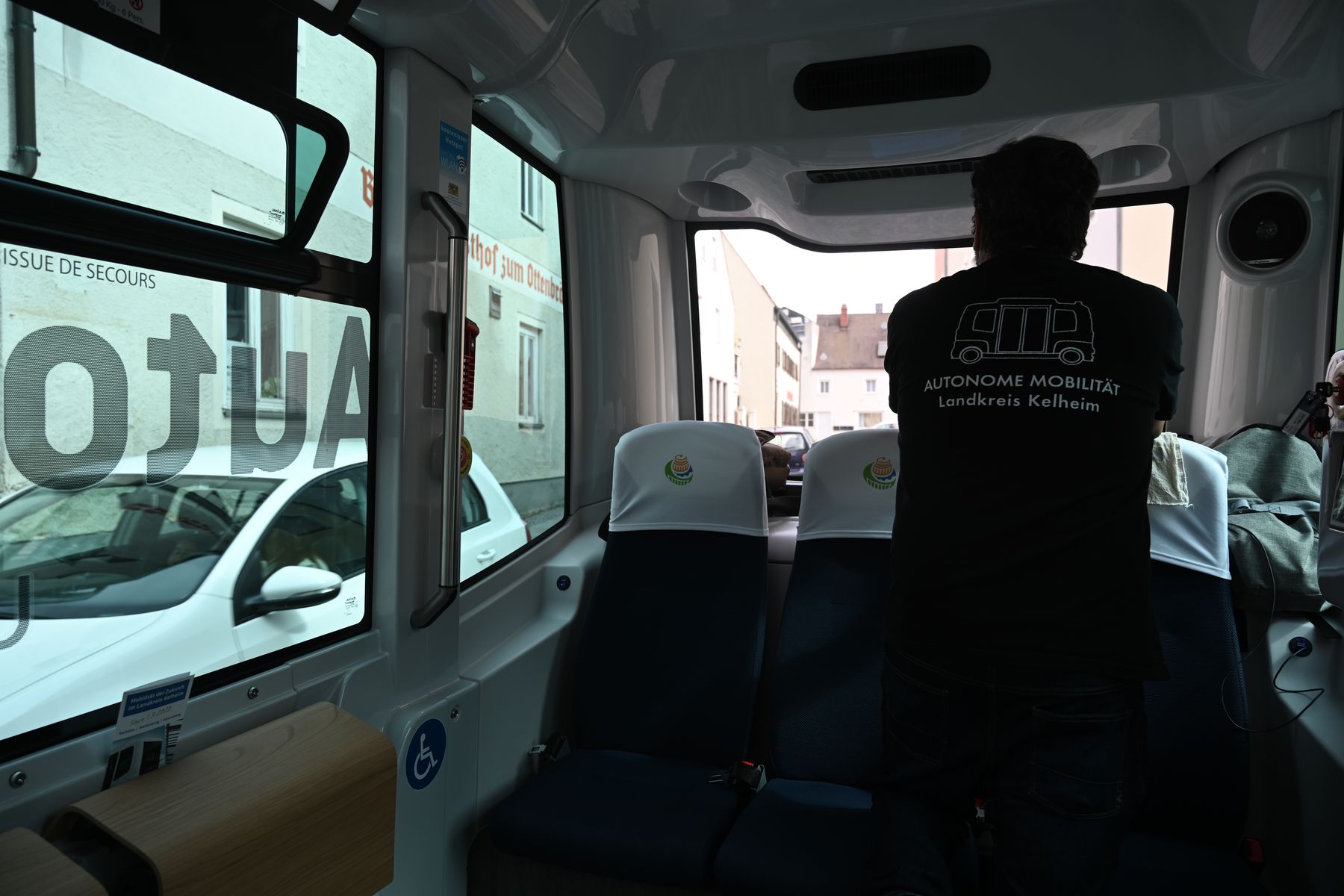 Auch wenn es so hier so aussieht, als würde er etwas machen, machte er in diesem Moment nichts. Im überwiegenden Teil der Fahrt erklärte er uns das Fahrzeug und die Technik. Nur gelegentlich musste er einschreiten und zwar immer dann, wenn ein anderes Fahrzeug die eigentliche Spur versperrte. Der Bus, so der Begleiter, habe eine künstliche Intelligenz und nutze Laser, GPS und Radar. Ich empfand die Fahrt als extrem angenehm. Auffällig waren die anderen Autofahrer, die teilweise den langsam fahrenden Bus eilig und verbotenerweise überholten und uns dadurch noch weiter ausbremsten.