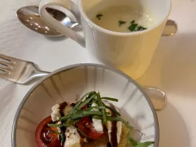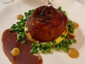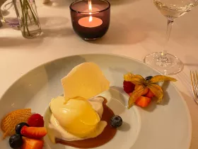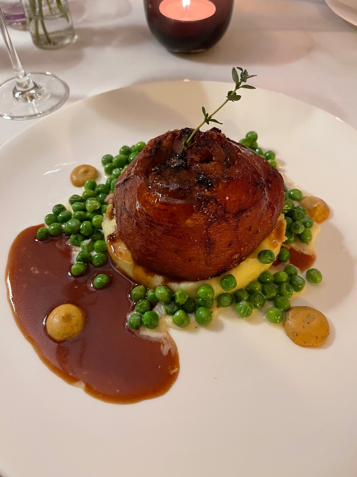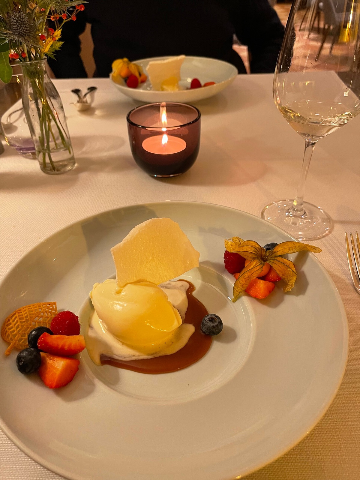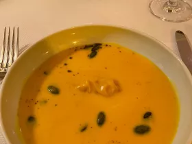 • Wir hatten gestern Hochzeitstag und waren mal wieder in unserem Lieblingslokal in der Nähe , einem Romantikhotel 🥰 und waren wieder schwer begeistert . Das Menü beginnt immer mit einem besonderen Olivenöl, Oliven und div. Baguettes - dann geht es los mit :Zitronengras Schaumsüppchen - Röstbaguettescheibchen mit Tomate /Büffelkäse, Kürbissuppe mit Dim Sum- kross confiertes , entbeintes Eisbein auf Kartoffelpüree mit Senfcreme, Erbsen und „geheimer Soße“- hausgemachtes Vanilleis mit Meringue auf Salzkaramell und frischen Früchten. Dazu ein Riesling und zum Abschluss Espresso mit Praliné