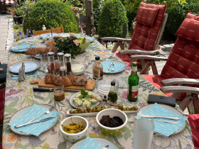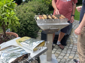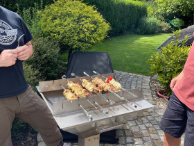 Wir hatten am WE ein kleines Familientreffen ( viel zu selten) , mit russischem Schaschlik , Huhn und Schwein, das zwei Tage lang mariniert wird und diversen selbstgemachten Antipasti , Brot, Relish usw. War sehr lecker , der Schaschlikgrill ist ein Eigenbau.