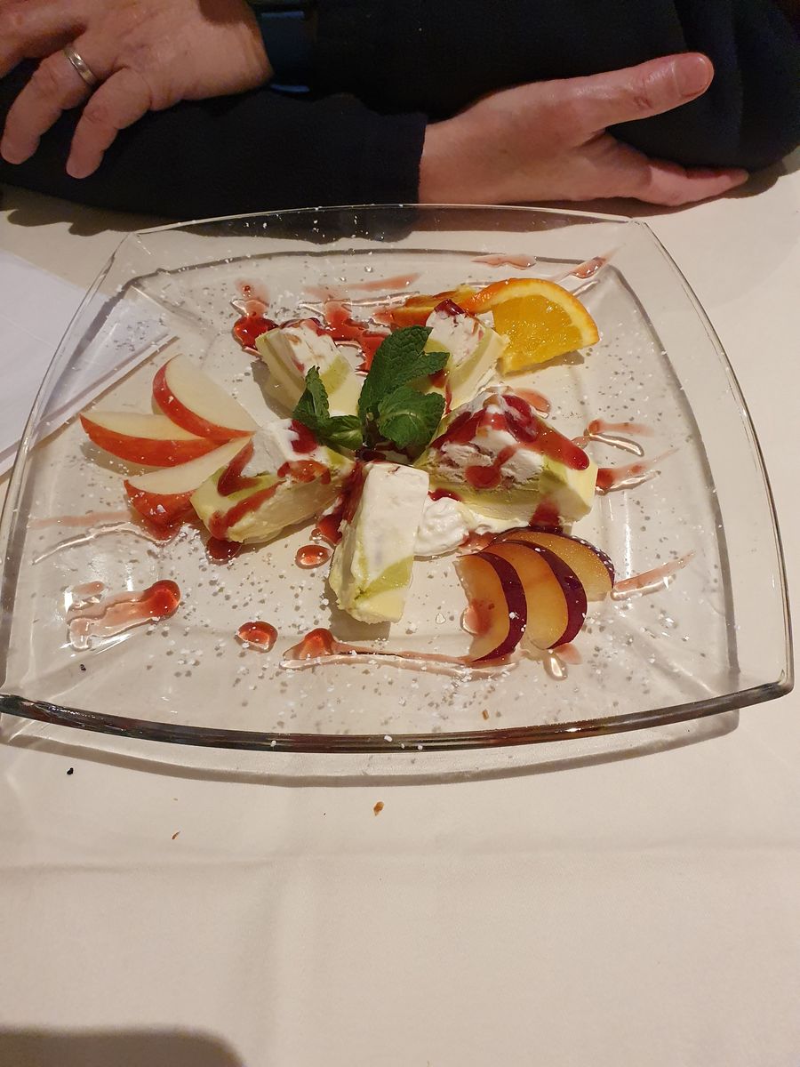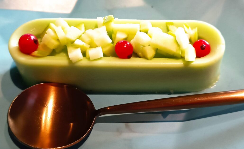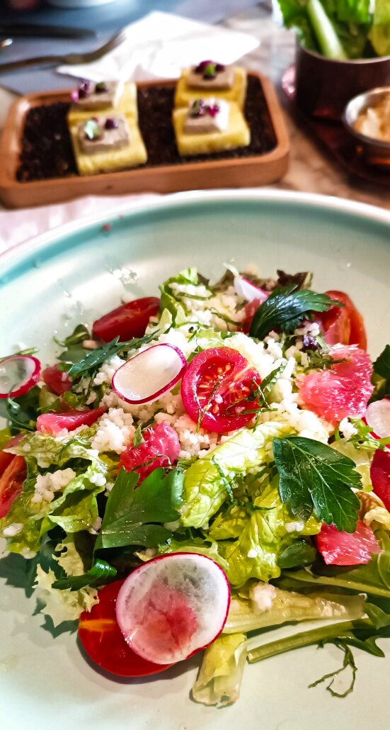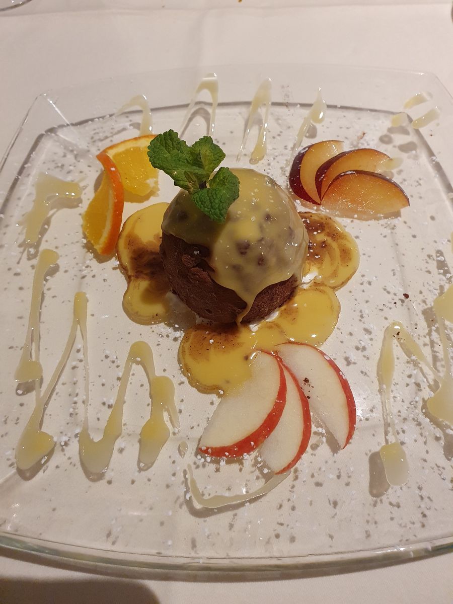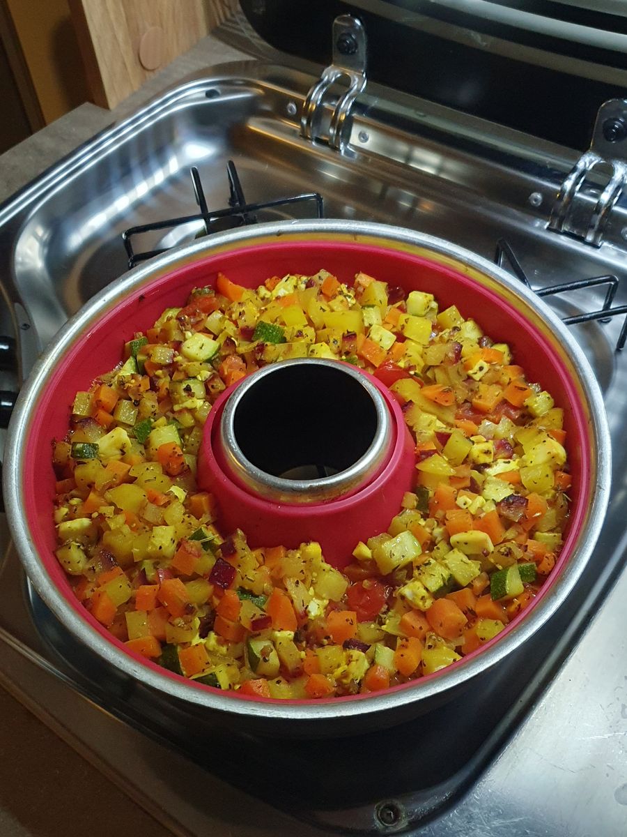 Couscous-Salat, Hähnchenbrust auf Röstgemüse und Kartoffelpüree und veganer "Apple-Cake" (eher ein Sojamilch-Pudding).