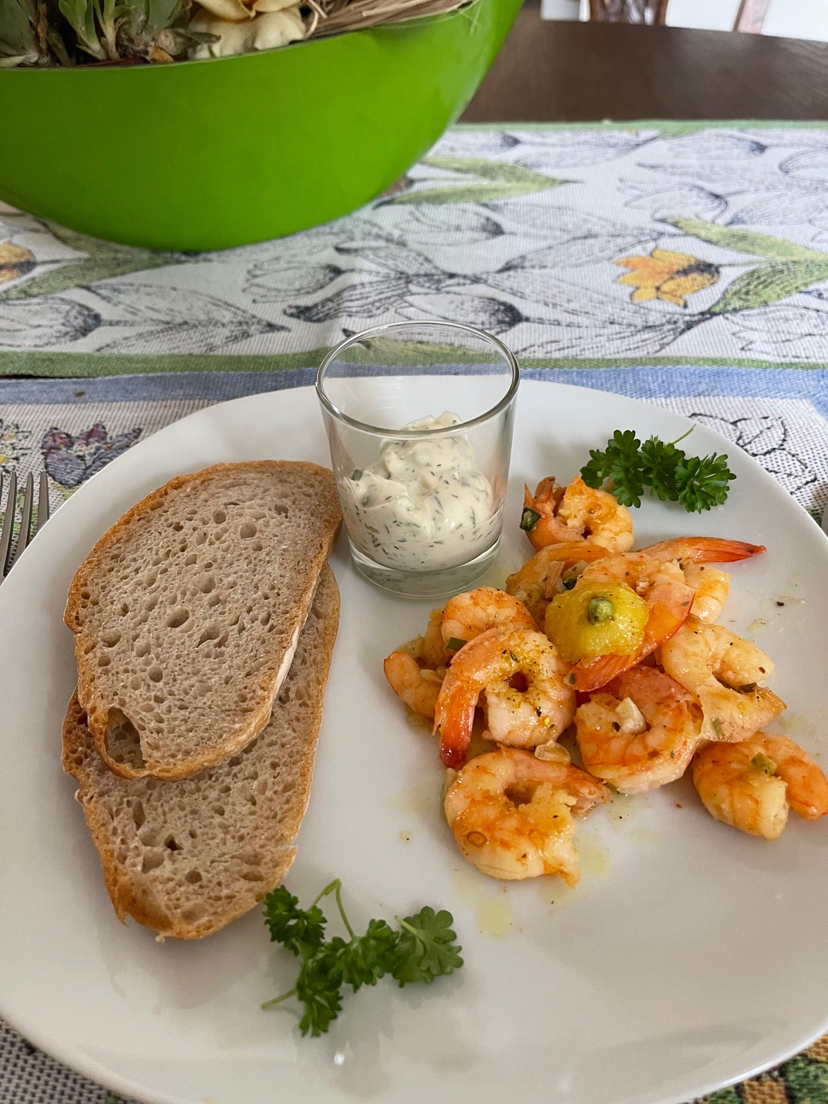 Chili Crevetten mit Knofi und Zitrone/Dill Dip- dazu frisch gebackenes Schweizer Ruchbrot