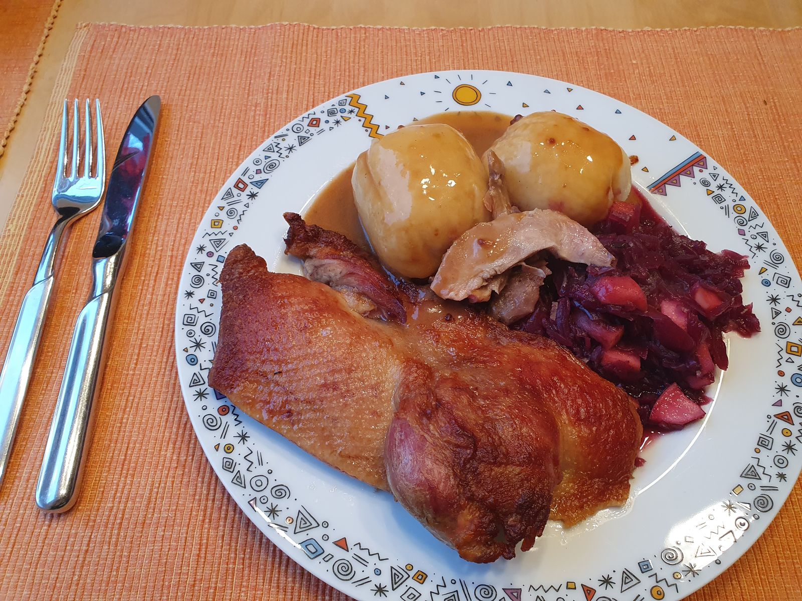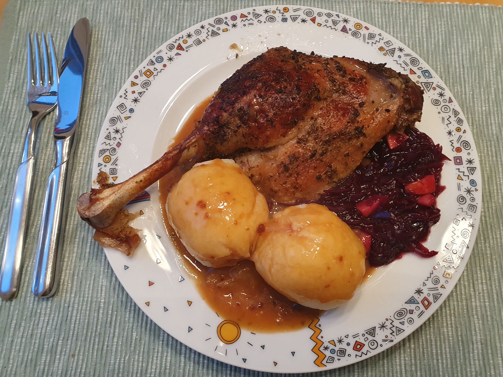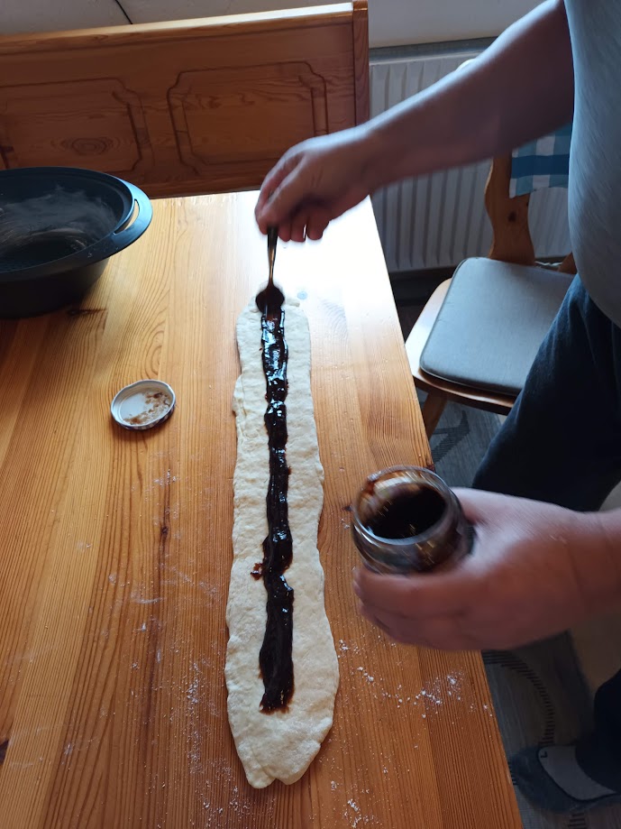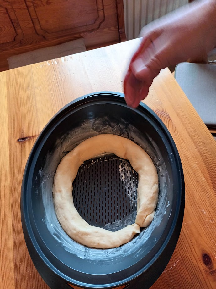 Hefeteig händisch angerührt, dann im Thermomix gegart. Wir haben uns gegen einzelne Knödel entschieden, und den Teig als Ganzes genommen und später aufgeschnitten.
