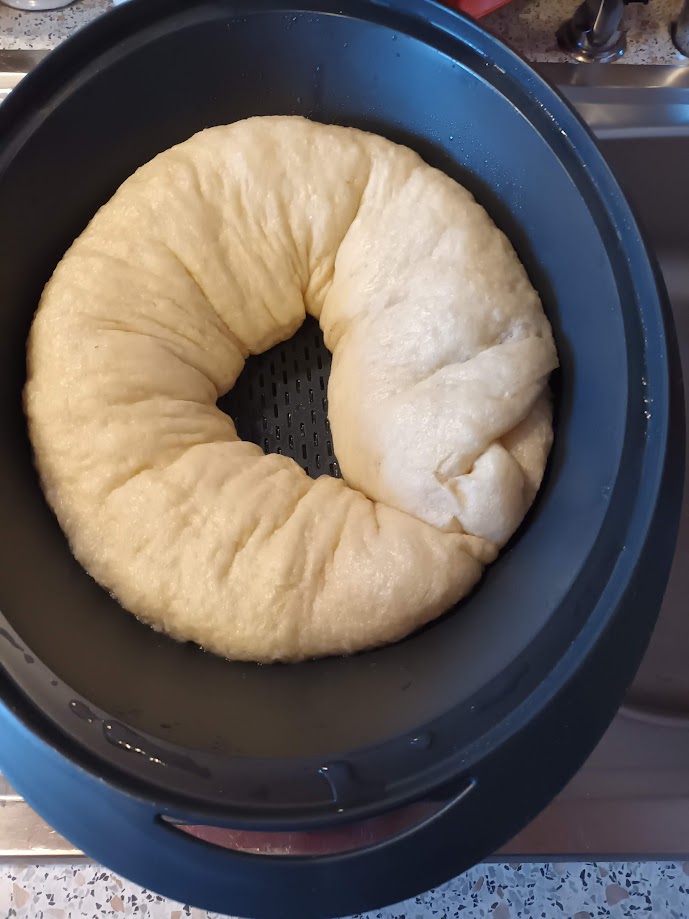 Gut aufgegangen, jetzt wurde er 20 Minuten im Thermomix "Varoma" im Wasserdampf gegart und dann natürlich verzehrt.