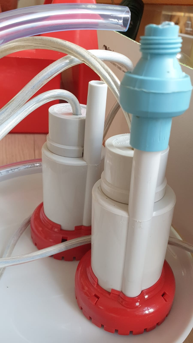 Vorn die alte, hinten die neue Pumpe. Zu erkennen ist oben das blaue Aufsatzstück, ein Rückschlagventil. Bei den Original-Pumpen in neueren Womos sind die u.U. verklebt und lassen sich nicht lösen.