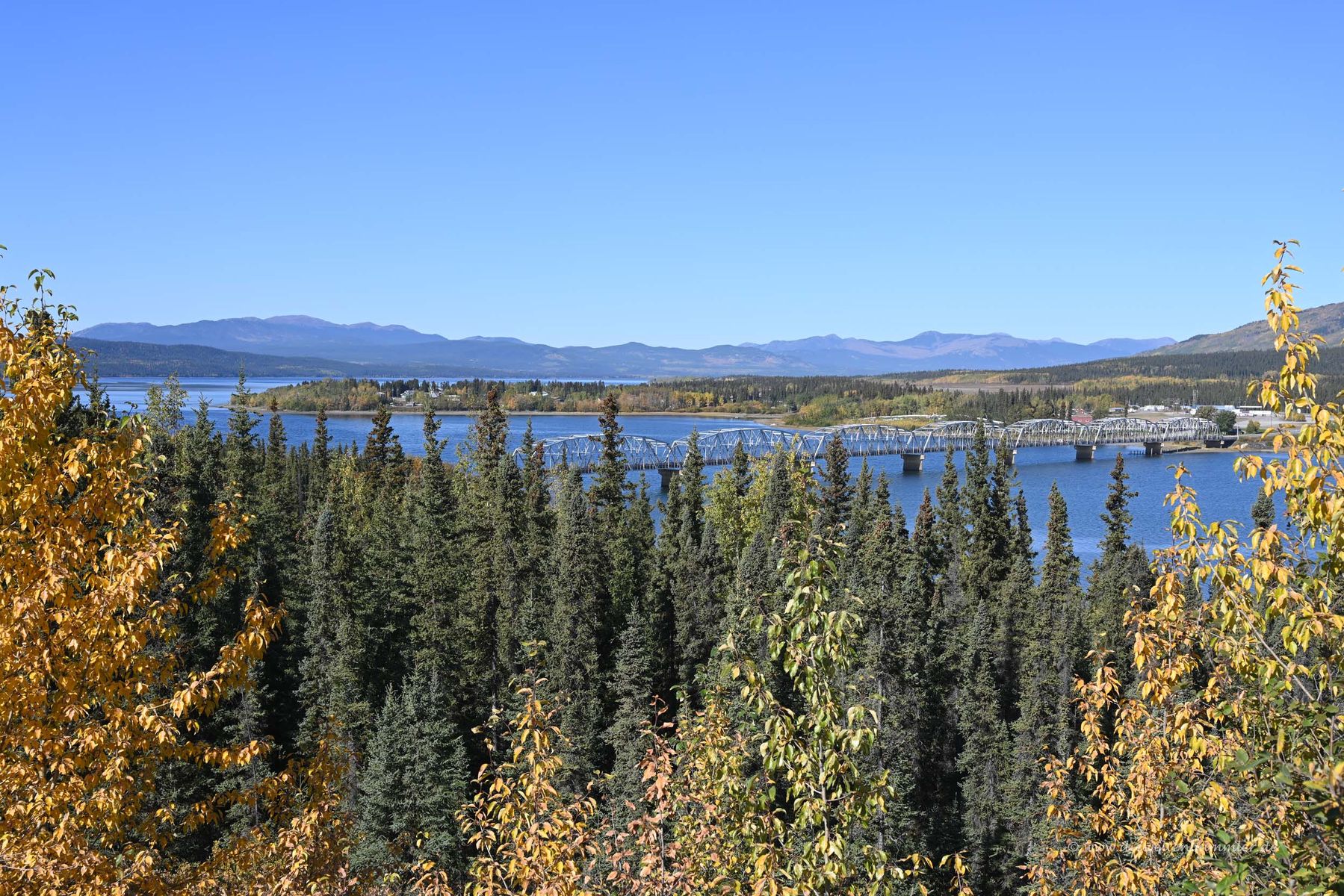 Richtig. Das heutige Bild zeigt die Nisutlin Bay Bridge in Kanada. Im Hintergrund sieht man die Ortschaft Teslin.