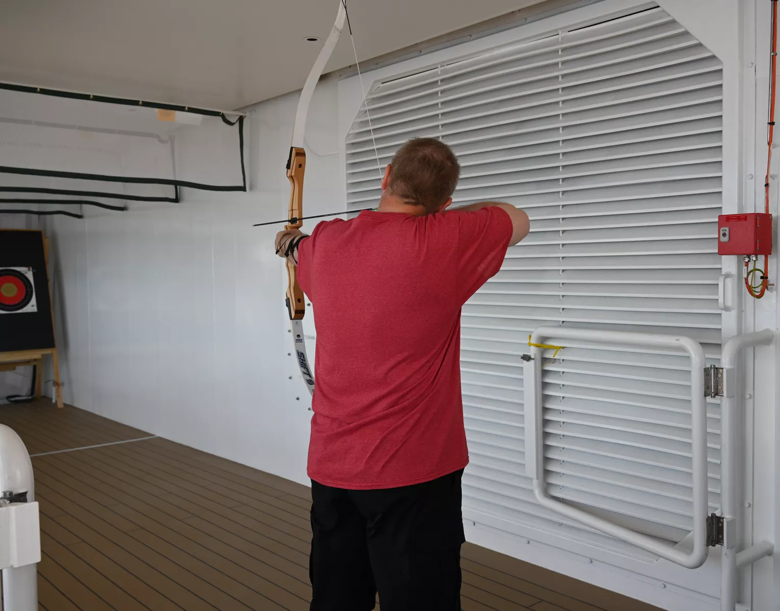 Und es sei wohl das einzige bzw. erste Schiff, auf dem man Bogenschießen kann. Gleich mal getestet, natürlich mit großer Sicherheitseinweisung und was alles so dazu gehört.