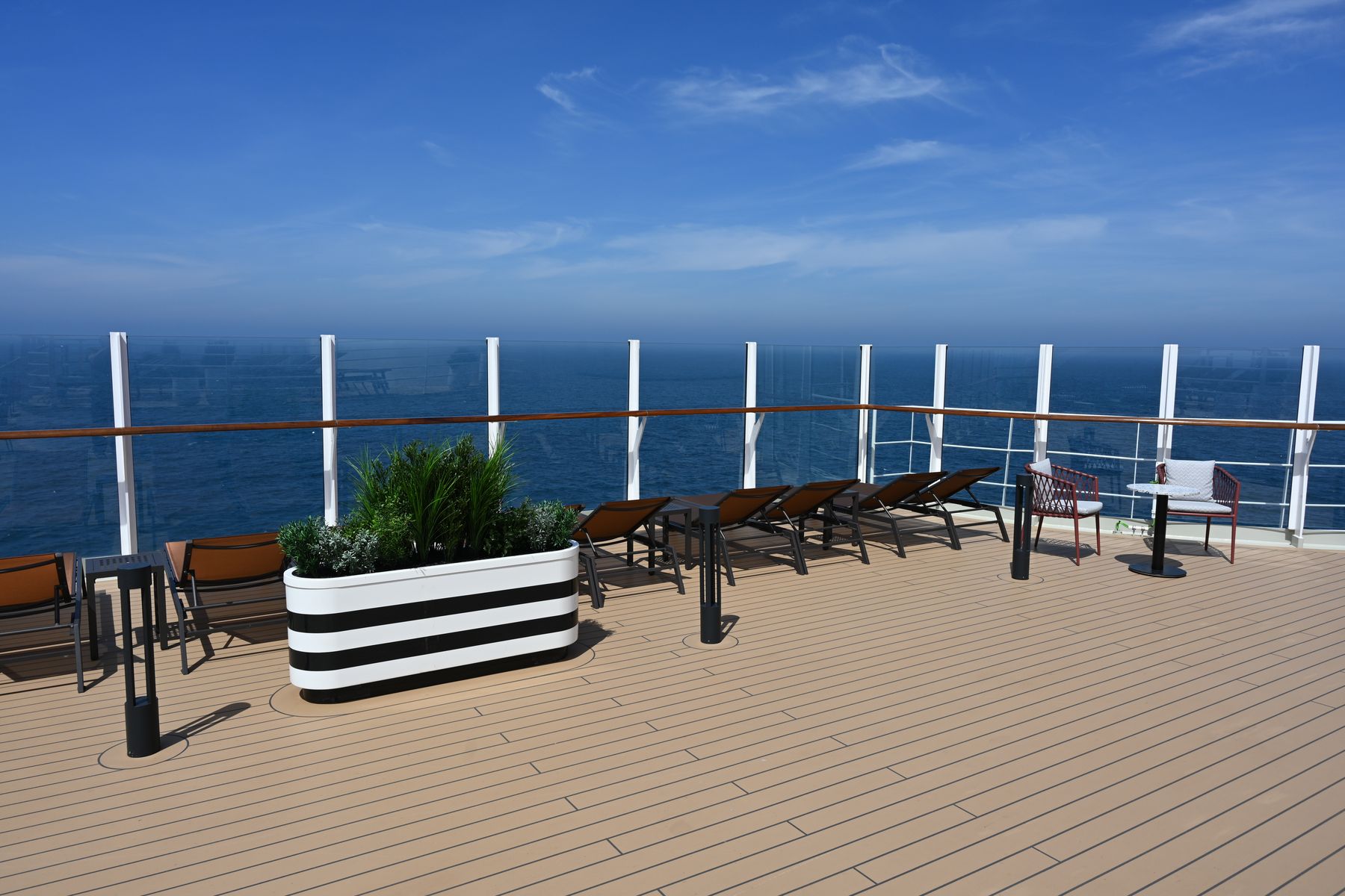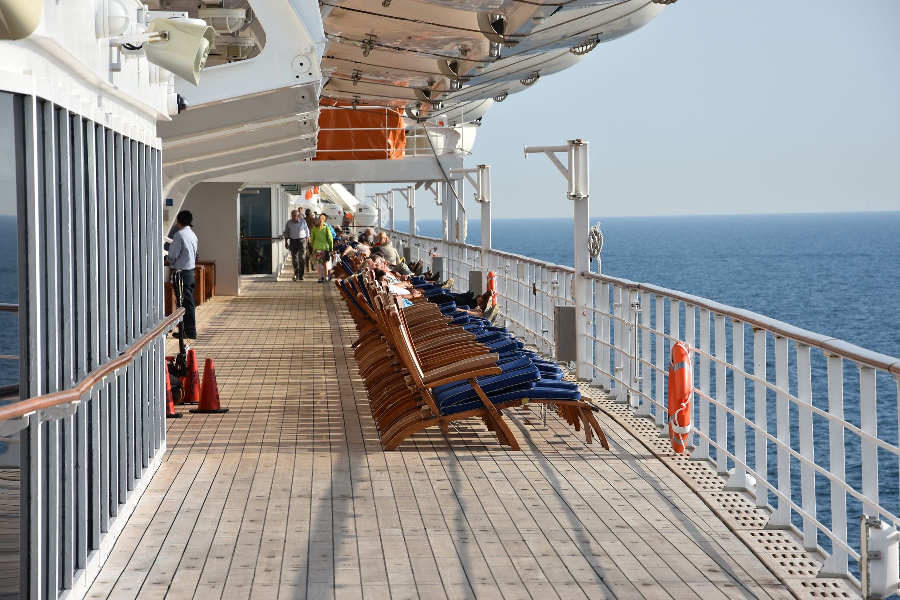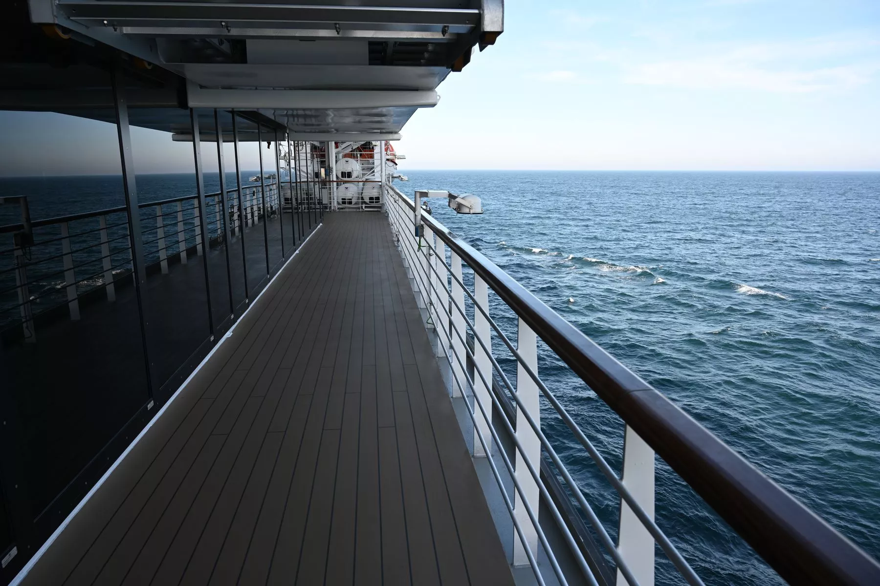 Hier sieht man auch, dass das Promenadendeck deutlich breiter ist und sogar Platz für die Liegen hat. Hier kann man trotzdem entspannt zu zwei nebeneinander spazieren. Und wenn am Abend die Liegen etwas zur Seite geräumt werden, ist da richtig viel Platz. Außerdem geht das so auf beiden Seiten von vorne bis hinten durch.