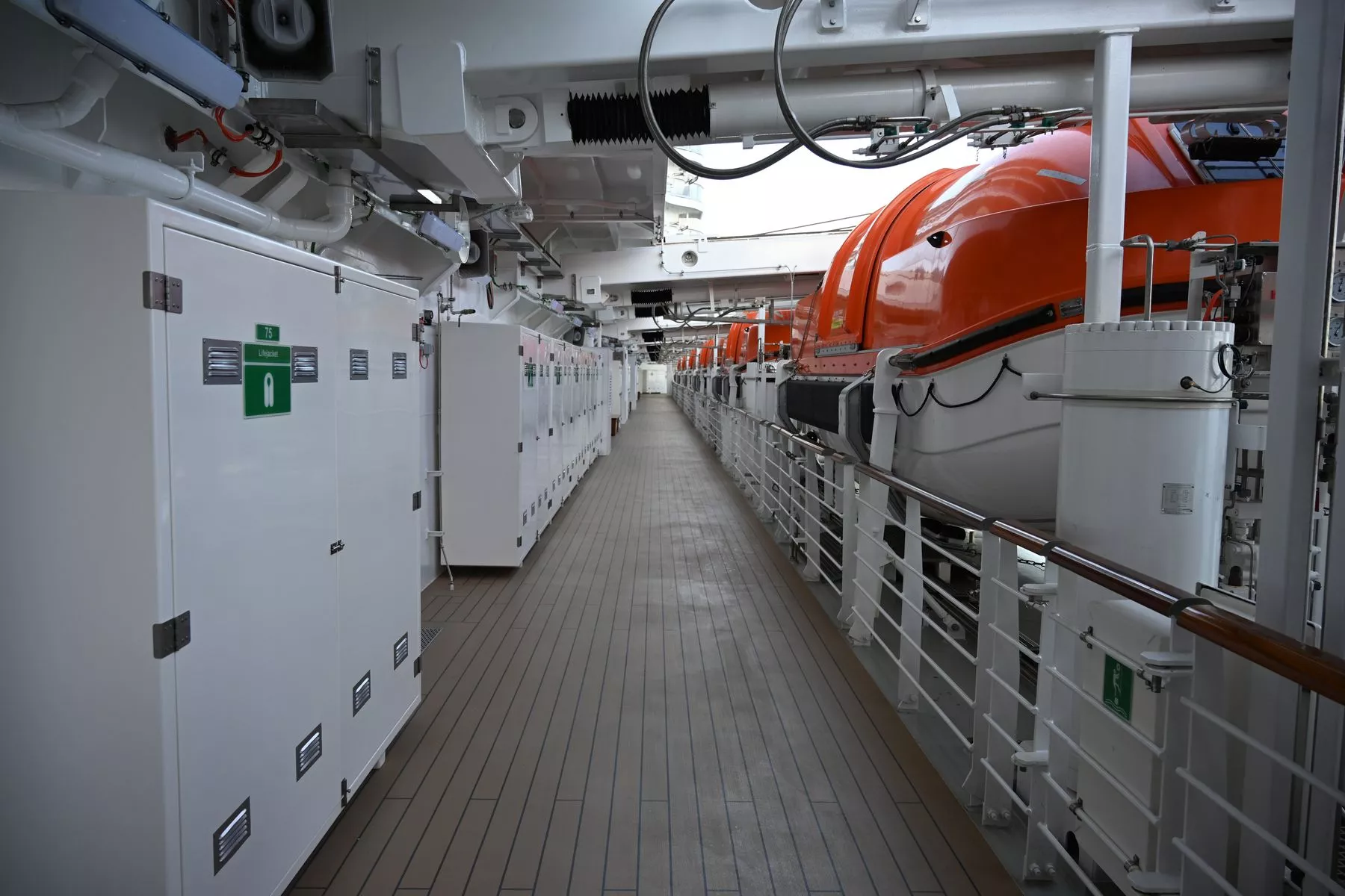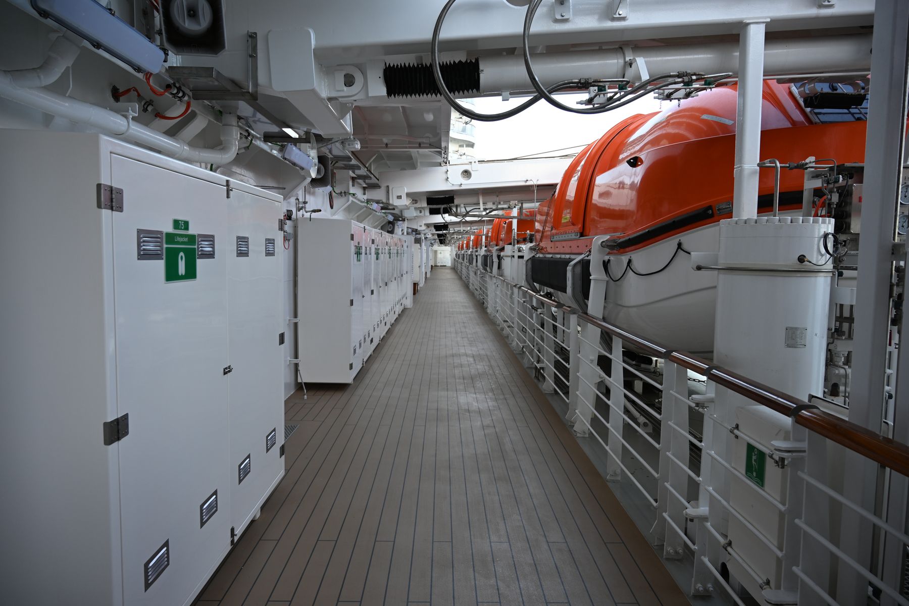 Dies ist ein kurzer Abschnitt auf der Queen Anne, bei dem man direkt an der Reling entlang läuft. Dieser Abschnitt ist auf beiden Seiten gleich lang und kommt jeweils zwei Mal vor, ist aber eben sehr kurz. Man sieht ja schon das Rettungsboot, vor dem man links abbiegt. Und dann geht es so weiter: