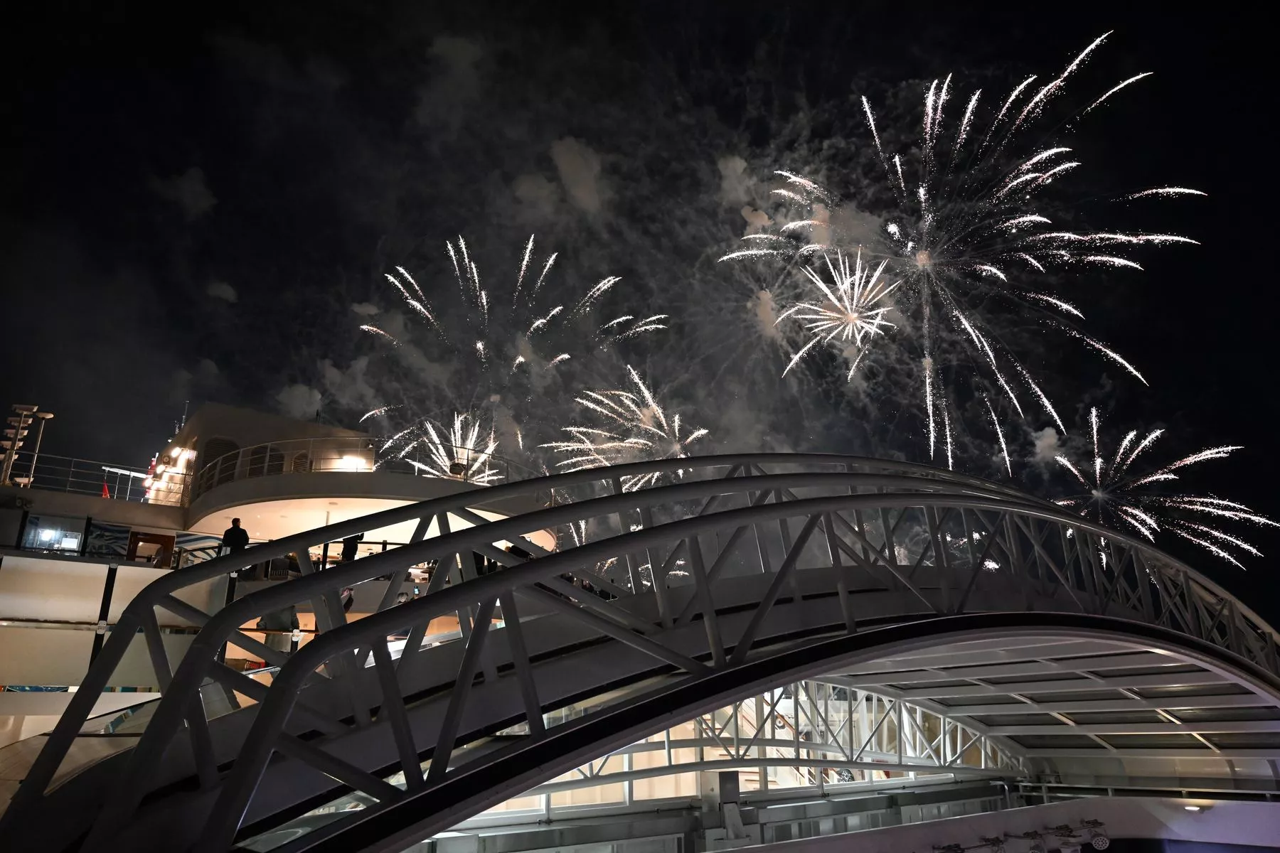 Feuerwerk beim Auslaufen aus Southampton. Das halbrunde Gestell im Vordergrund ist das geöffnete Dach über dem Pavilion Pool Deck.