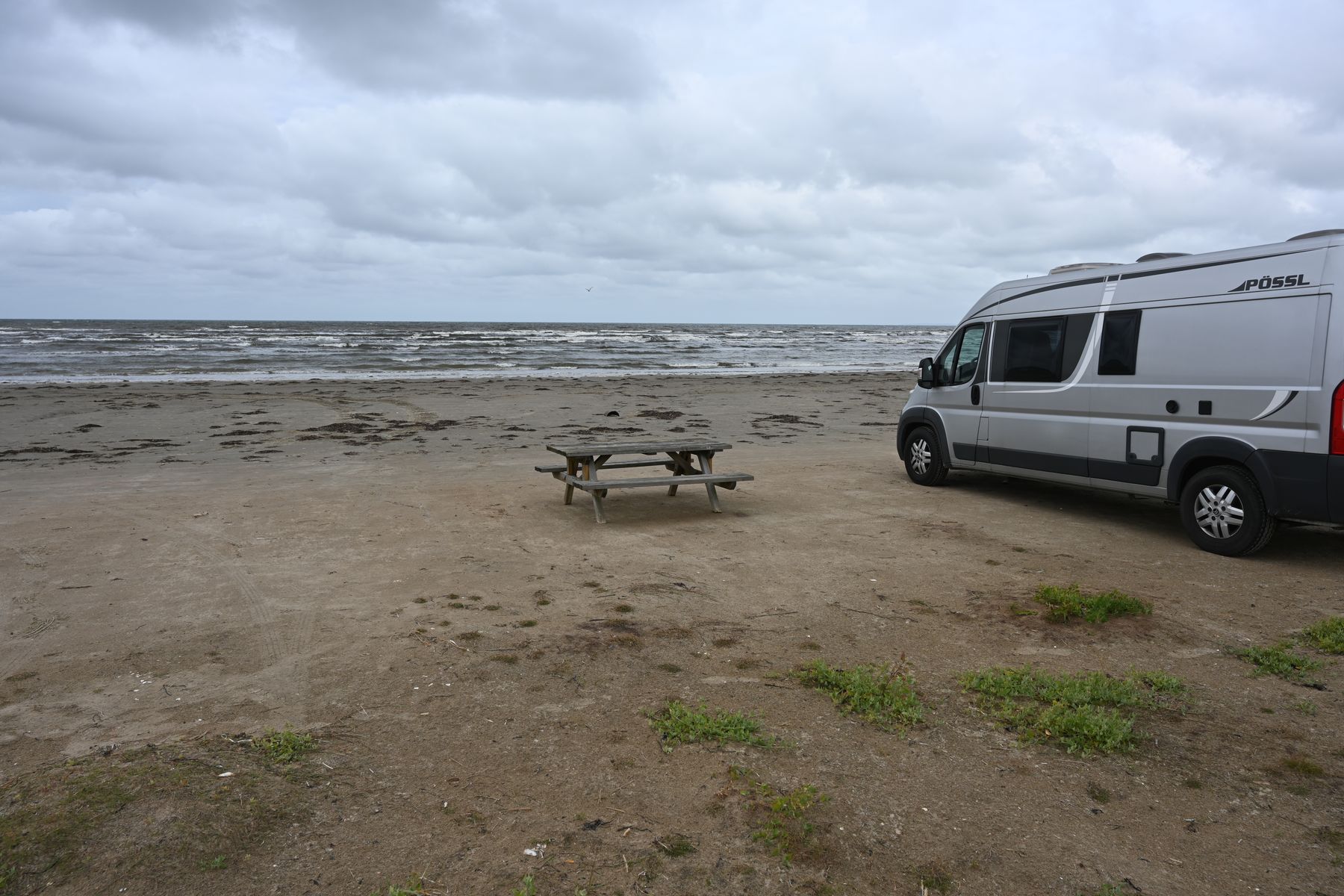 Am befahrbaren Skummeslövstrand war das Wetter nicht besonders schön. Aber wir hatten eh keine Zeit für Strandspäße. Direkt nach dem Bild ging es weiter an der Küste nordwärts.