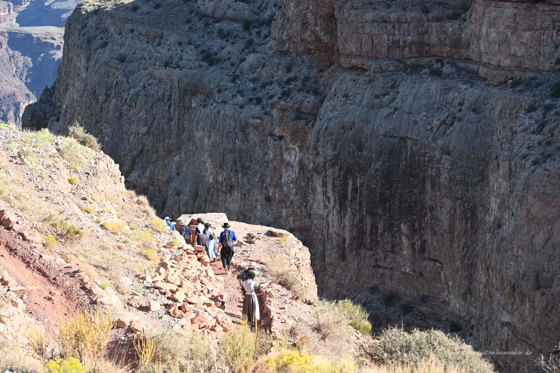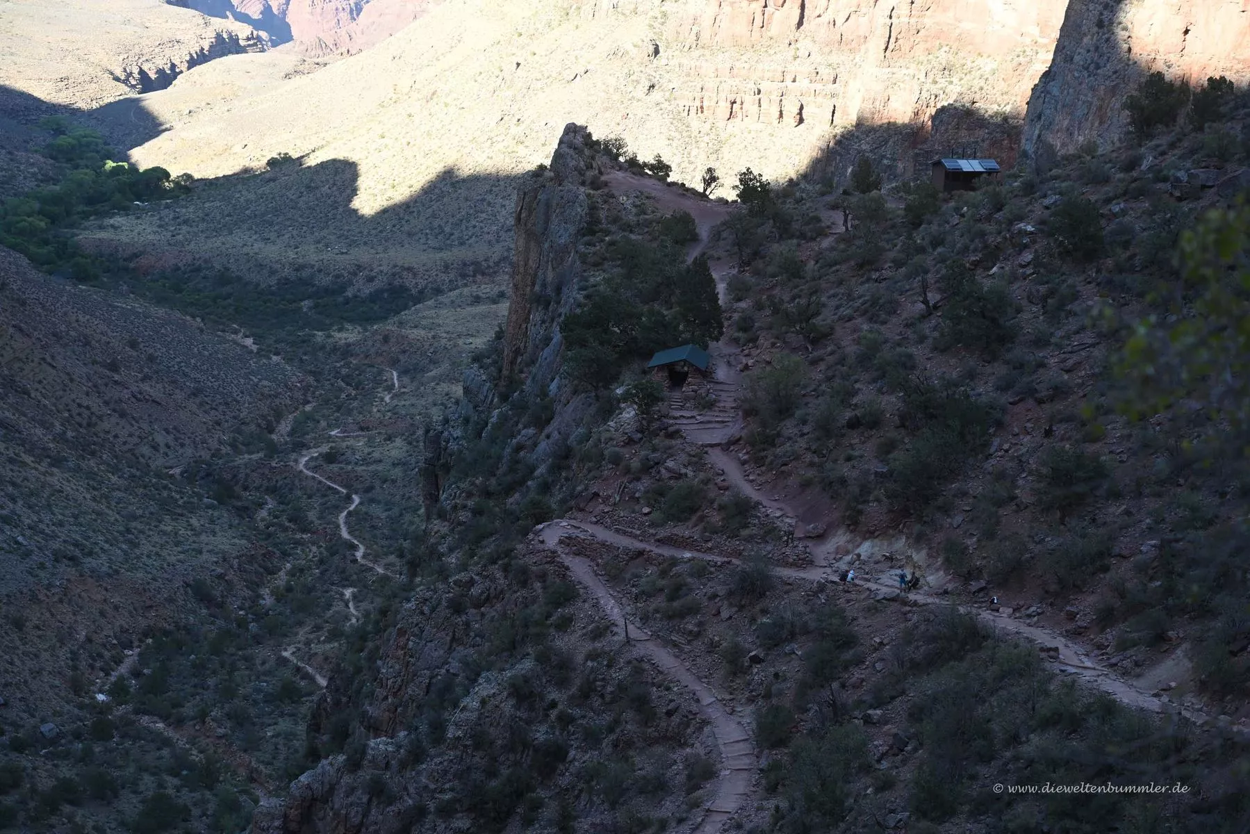An dieser Stelle geschah dann etwas, womit wir nicht mehr gerechnet hatten: Unten aus dem Tal kamen die Amish. Sie waren bis zur Phantom Ranch am Colorado River gegangen und waren schon beim Aufstieg. Das war die Strecke, die wir eigentlich machen wollten, aber sicherheitshalber mit dem Tonto Trail abkürzten. Wir staunten nicht schlecht. Drei Personen blieben jedoch für diese Nacht unten am Indian Garden. Sie schafften es einfach nicht mehr und würden eine Nacht an der Rangerstation verbringen, um dann am nächsten Tag den Aufstieg zu absolvieren.