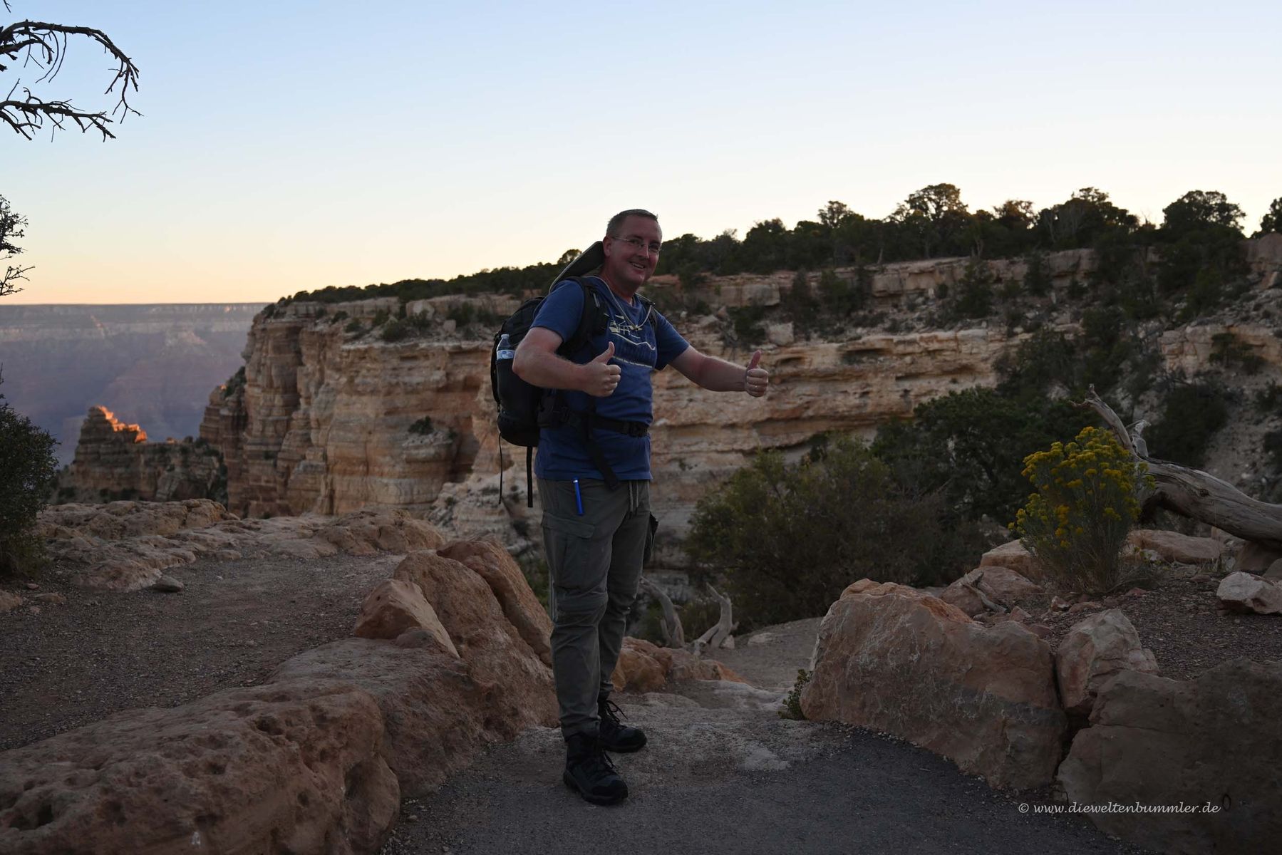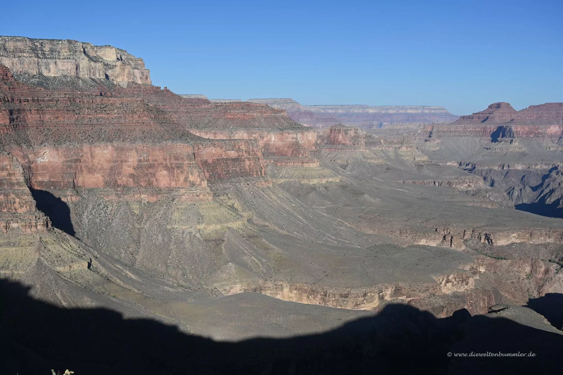 Da wir nun nicht einfach nur runter und wieder raufgehen wollten, sondern lieber eine Art Rundkurs bevorzugten, mussten wir uns eine Strategie überlegen. Denn wir wollten den uns unbekannten South Kaibab Trail hinunter und auf dem uns bekannten Bright Angel Trail wieder hinauf. Die Ein- und Ausstiege sind jedoch an der Canyon-Kante mehrere Kilometer voneinander entfernt. Egal, wo man also parkt, muss man oben noch viele Kilometer an der Kante entlang wandern. Das sahen wir so ein bisschen als Zeitverschwendung und so hofften wir, dass wir das mit dem Shuttle-Bus zeitlich noch hinbekommen würden.