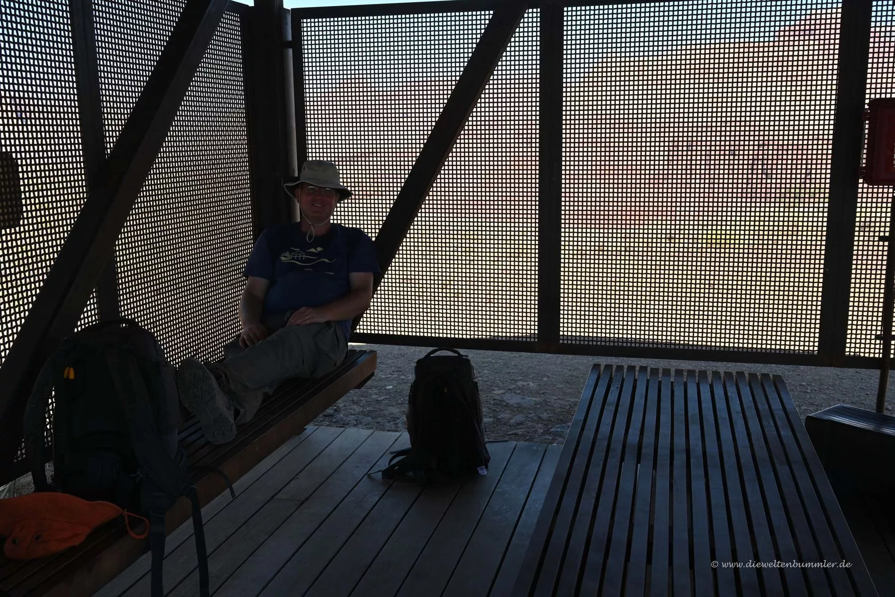 Der Shelter war absolut angenehm. Obwohl er mitten in der Sonne stand, war es darin sehr, sehr kühl. Es muss wohl an diesen löchrigen Metallgittern gelegen haben. Hier konnte man es sehr gut aushalten.