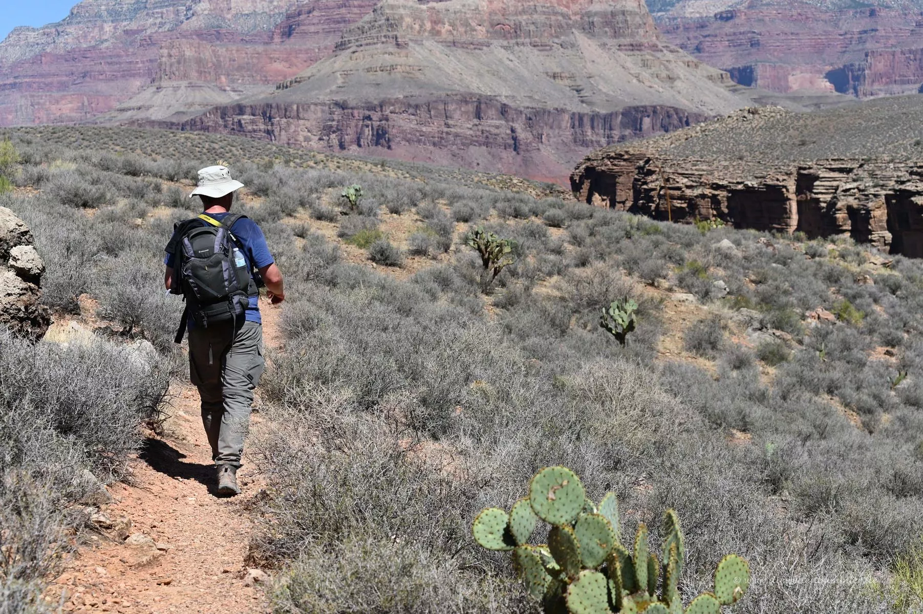 Nach einer ausgiebigen Pause begann dann die vermeintlich einfache Wanderung auf dem Tonto Trail. Ganz so eben war der Weg nicht. Es ging immer wieder leicht bergauf und bergab, doch die größte Anstrengung war die Hitze. Auf den letzten zwei Kilometern habe ich mich nur noch gequält und ich hatte angenommen, dass ich es nicht schaffen würde. Zwei Mal habe ich mich einfach auf den Weg gelegt, um meinen Kopf in den Schatten zu bringen, wenn es denn welchen durch die Sträucher, Kakteen oder kleinere Felsen gab. Meine Frau war schon recht besorgt um mich, weil ich wirklich fix und fertig war. Und durch meinen Kopf schwirrte immer der Gedanke, dass wir ja auch noch wieder rauf müssten. Das war für mich kaum vorstellbar.