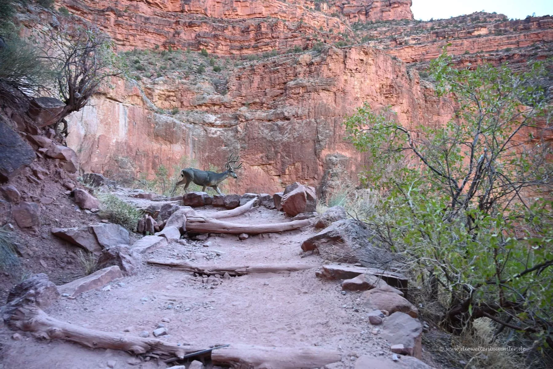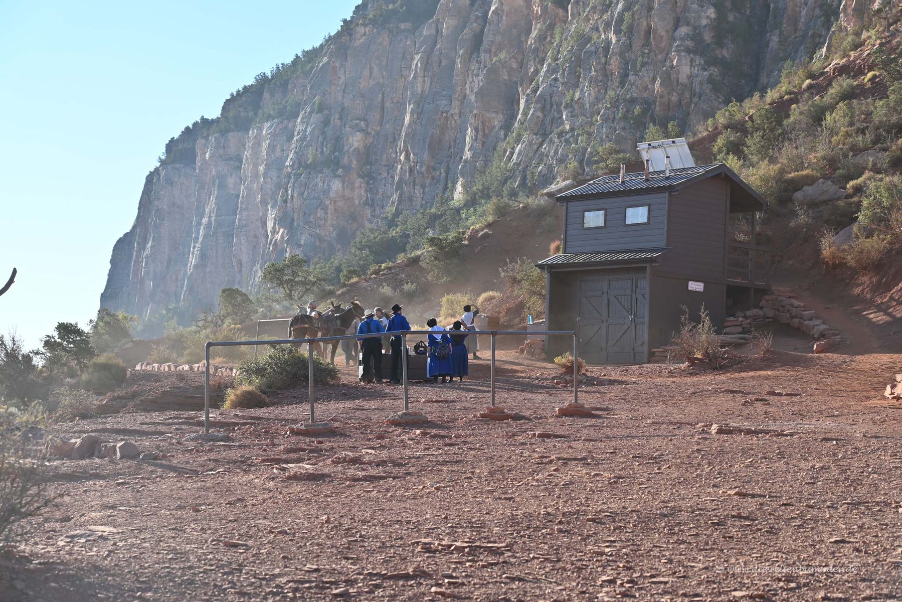 Im Morgengrauen standen wir also am Einstieg in den South Kaibab Trail und sahen dort eine Gruppe von Amish-People, die wir in ihrer klassischen traditionellen Kleidung für Tagesbesucher hielten. Doch weit gefehlt. Kurz nachdem wir die ersten Höhenmeter hinter uns hatten, kam die Gruppe hinter uns her. Neun Amish liefen ganz ohne Ausrüstung und nur mit alten Wasserkannen ausgestattet den Trail hinab.