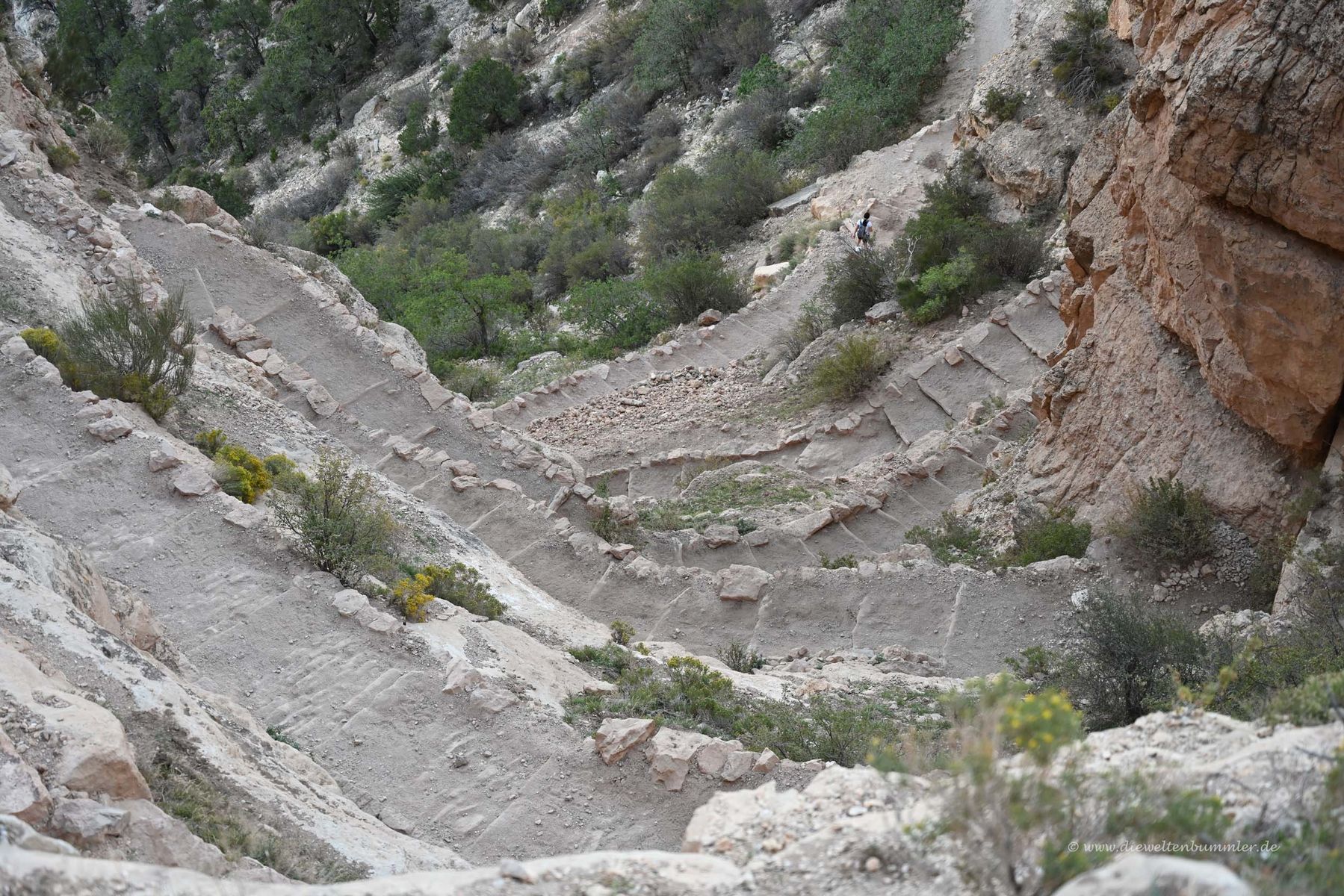 Der Abstieg und das Verbindungsstück Tonto Trail waren geschafft. Jetzt folgte zum Abschluss noch der Aufstieg mit seinen knapp 1000 Höhenmetern auf sieben Kilometern. Doch dieser lag mittlerweile im Schatten, was an diesem Tag eigentlich schon Voraussetzung sein musste, um das überhaupt zu schaffen.