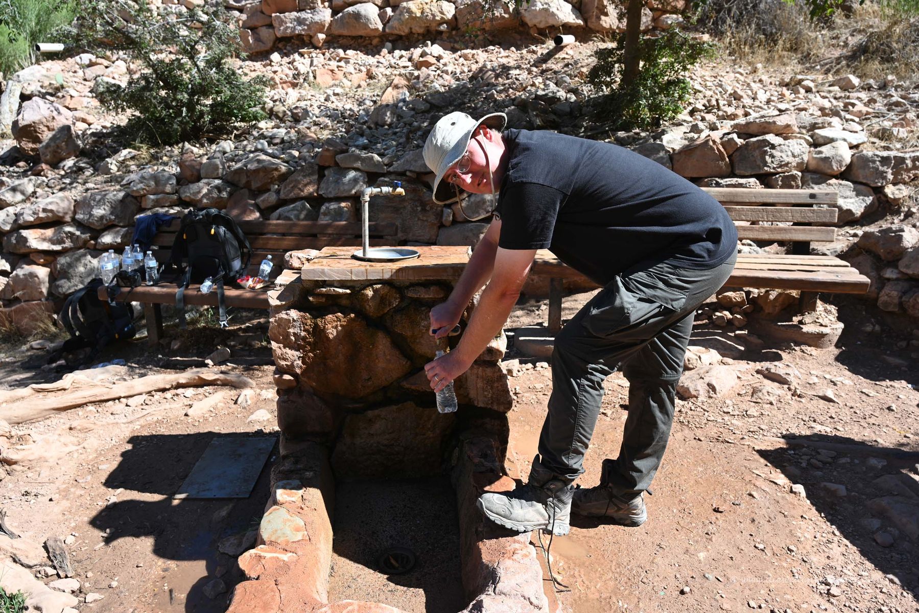 Völlig erschöpft kamen wir am Indian Garden an, eine Art Oase mit einer Rangerstation, einem Campingplatz, Bäumen und einem sehr kleinen Bach. Eine Rangerin gab uns den Tipp, uns in den Bach zu legen. Einfach so, wie wir waren. Ja, und das tat ich auch. Handy weg, Kamera weg, Schuhe aus und dann ab ins Wasser. Ich habe mich in den Bach gelegt und war einfach nur noch glücklich. Das Wasser war gerade mal wenige Zentimeter hoch, aber es tat sehr gut. Fotos davon werde ich nicht zeigen, denn ich sah wirklich aus wie eine Leiche. Zwischendurch bin ich auch eingeschlafen. Wer weiß, vielleicht war ich sogar bewusstlos. Keine Ahnung. Auf jeden Fall lag ich zwei Stunden in diesem schmalen Wasserlauf und kühlte meinen Körper runter. Ich war so fertig, wie ich es noch nie war und ich befürchte, ich stand kurz vor einem Hitzschlag oder so was in der Art. Aber das kühlende Wasser half. Mir war in diesem Moment völlig egal, welche Spinnen, Skorpione oder sonstige Tiere über mich und in meine Kleidung krabbelten. Ich wollte einfach nur daliegen.