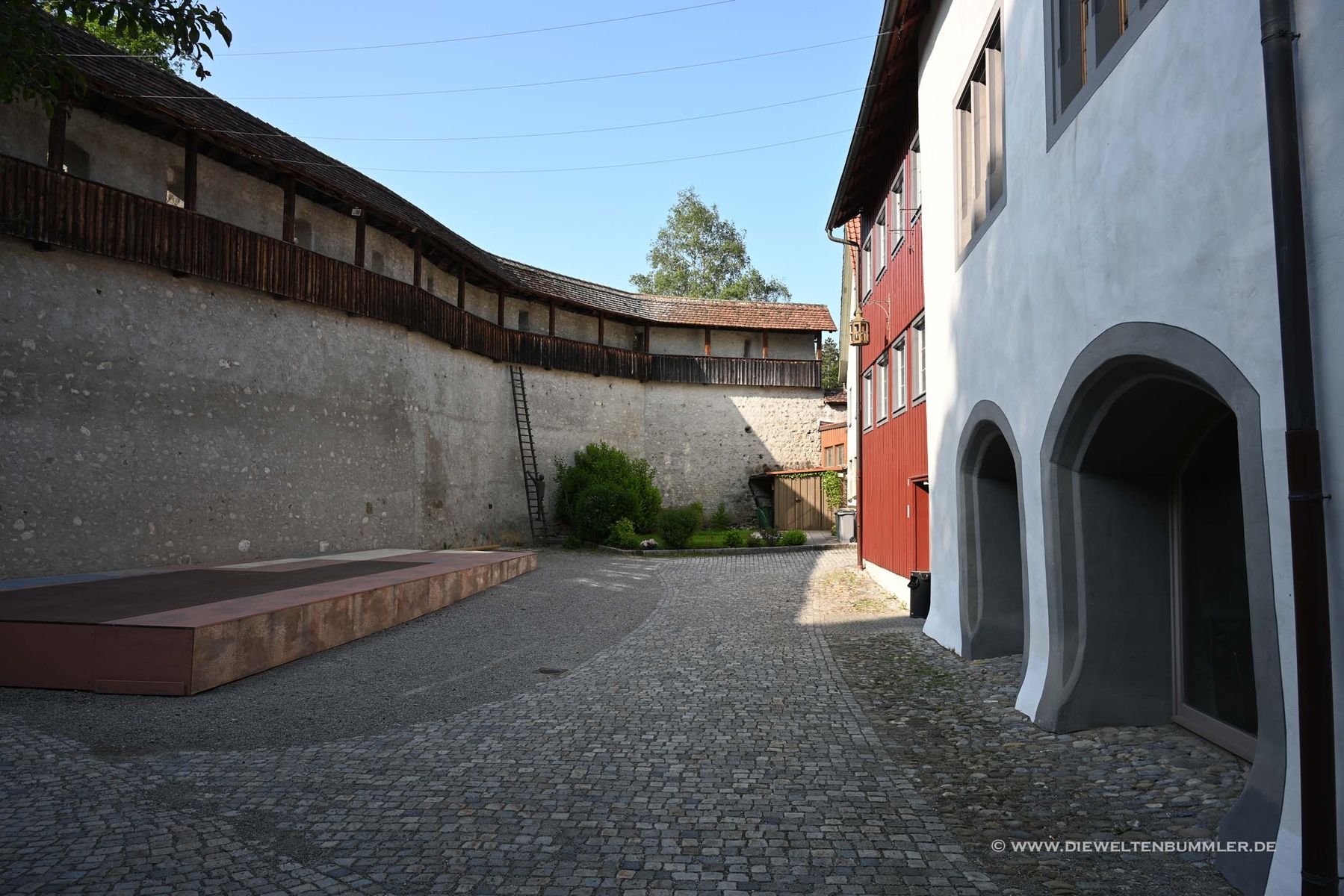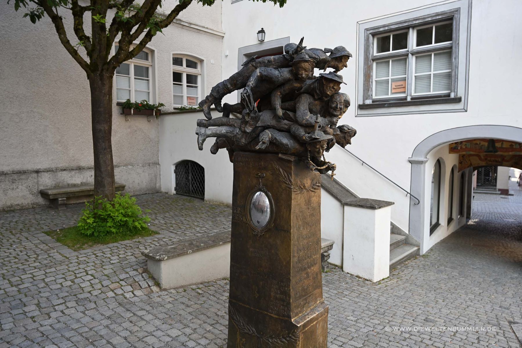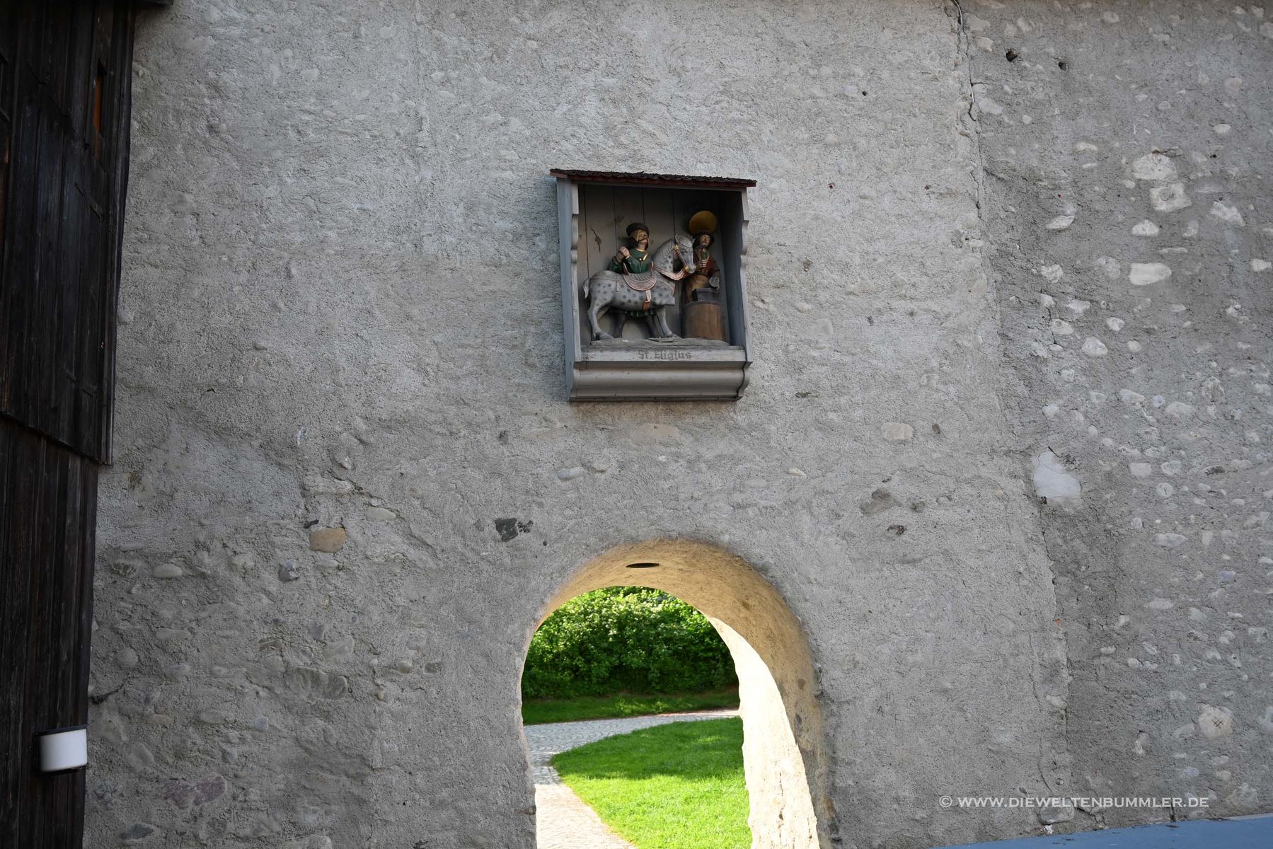 Der kleine Mann auf der Leiter versucht die Stadtmauer zu überklettern.