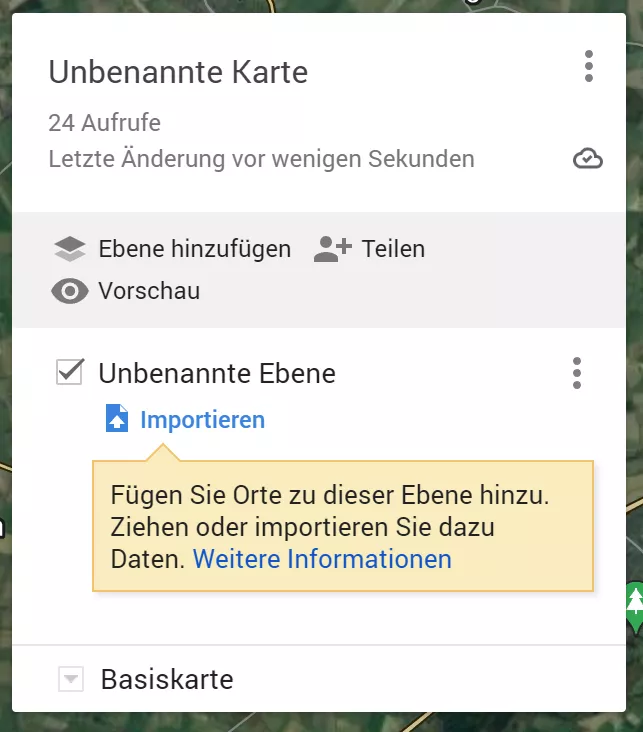 Man klickt im Menü links auf "Gespeichert", auf "Karten" und dann auf "My Maps öffnen". Hier ist eigentlich fast alles selbsterklärend: