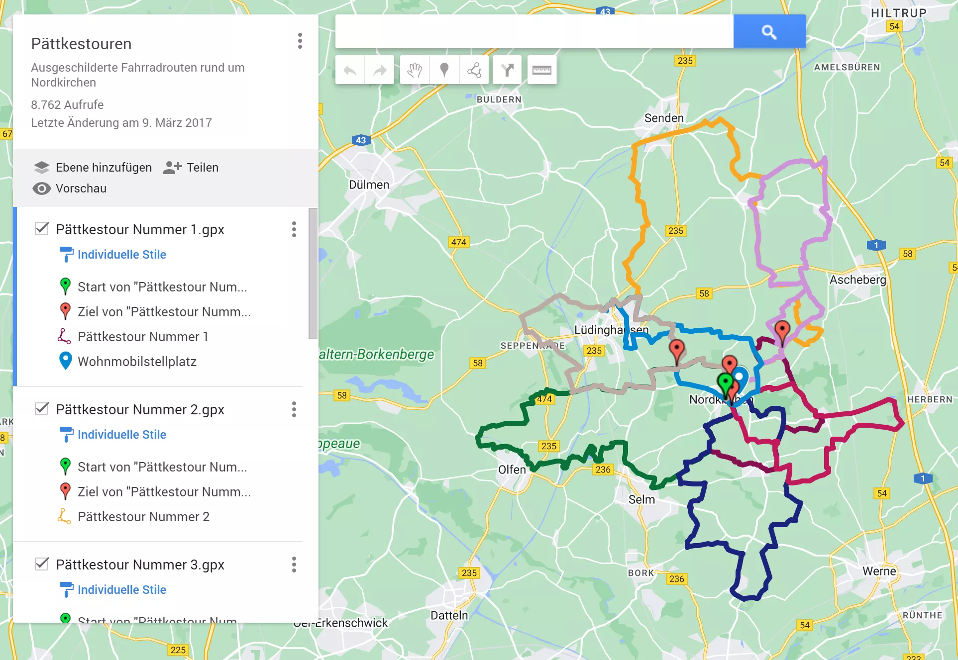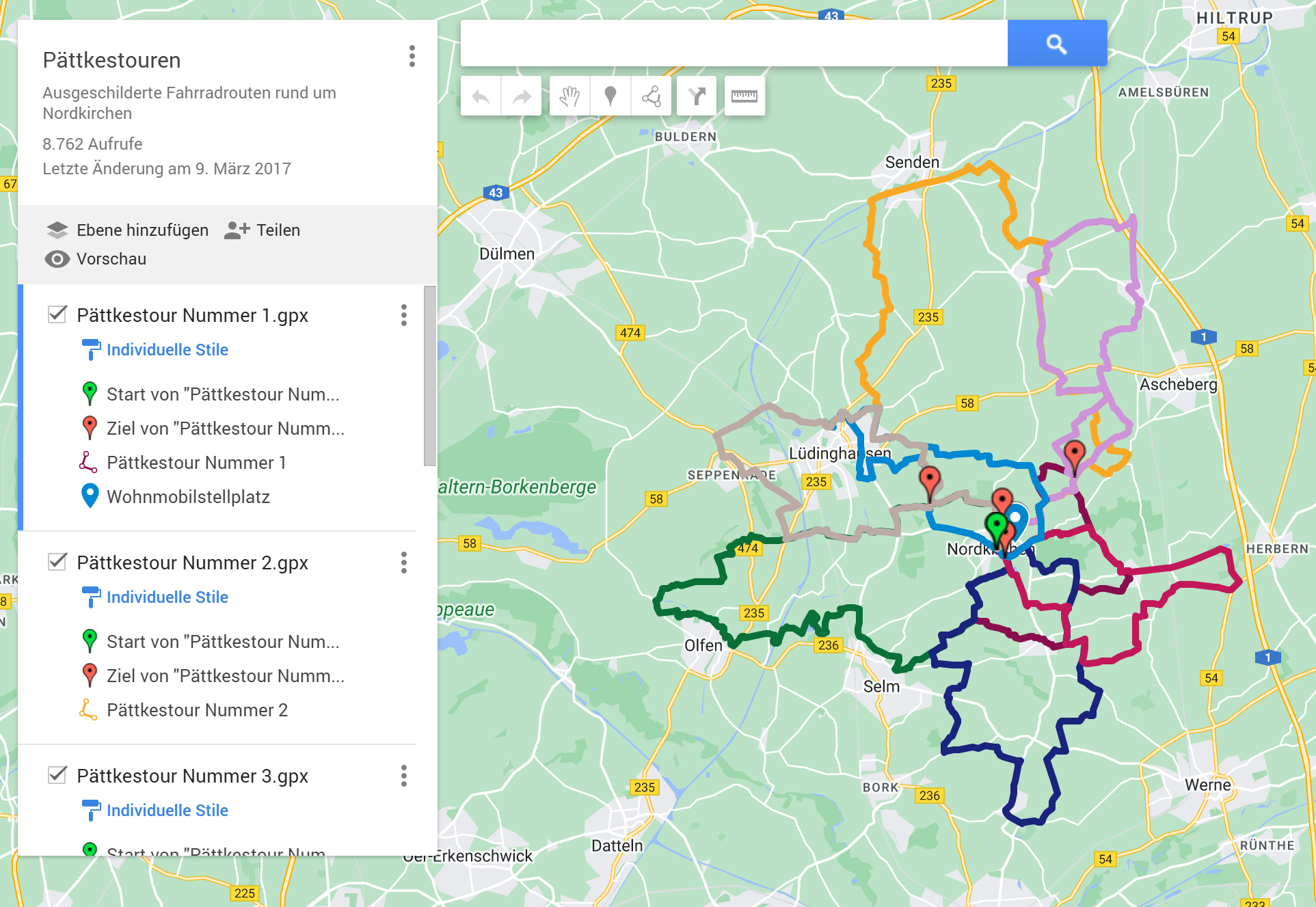Die Karte kann man benennen und dann hat man die Möglichkeit, bis zu 10 Ebenen zu erstellen. In diese Ebenen kann man dann Wegpunkte einfügen oder eben ganze Tracks. Hier mal ein Beispiel für die Pättkestouren (Radrundwege) rund um Nordkirchen, die ich vor ein paar Jahren für die Einbindung auf unserer Stellplatzseite angefertigt habe: