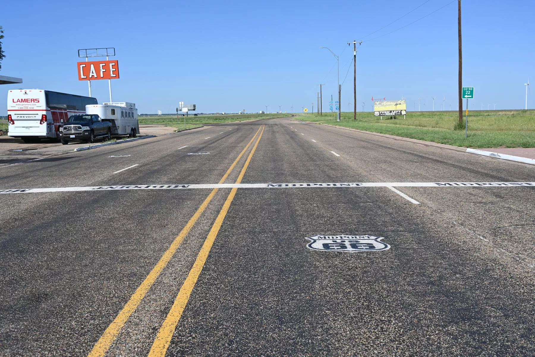In Adrian, Texas befindet sich der Mittelpunkt der Route 66. Ein Klassiker, wenn man der Straße folgt. Da hält man natürlich an. Und so kamen wir mit den Passagieren ins Gespräch. Es waren Norweger, die auf dieser geführten Route 66-Reise unterwegs waren. Wir haben natürlich ein wenig über die Mother Road geplauscht und uns darüber ausgetauscht, ob wir uns entlang der Strecke noch einmal begegnen würden. Wie das halt so ist.