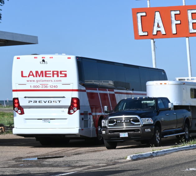 Es war einst im Jahr 2022, als wir die Route 66 befuhren und zwischen der Cadillac Ranch in Amarillo, Texas und der Grenze zu New Mexico immer wieder einen Reisebus trafen. An der Cadillac Ranch fiel er uns zum ersten Mal auf. In dem langen Dashcam-Video kann man den Bus auch sehen und zwar ab der 99. Minute. Da fahren wir hinter ihm her.