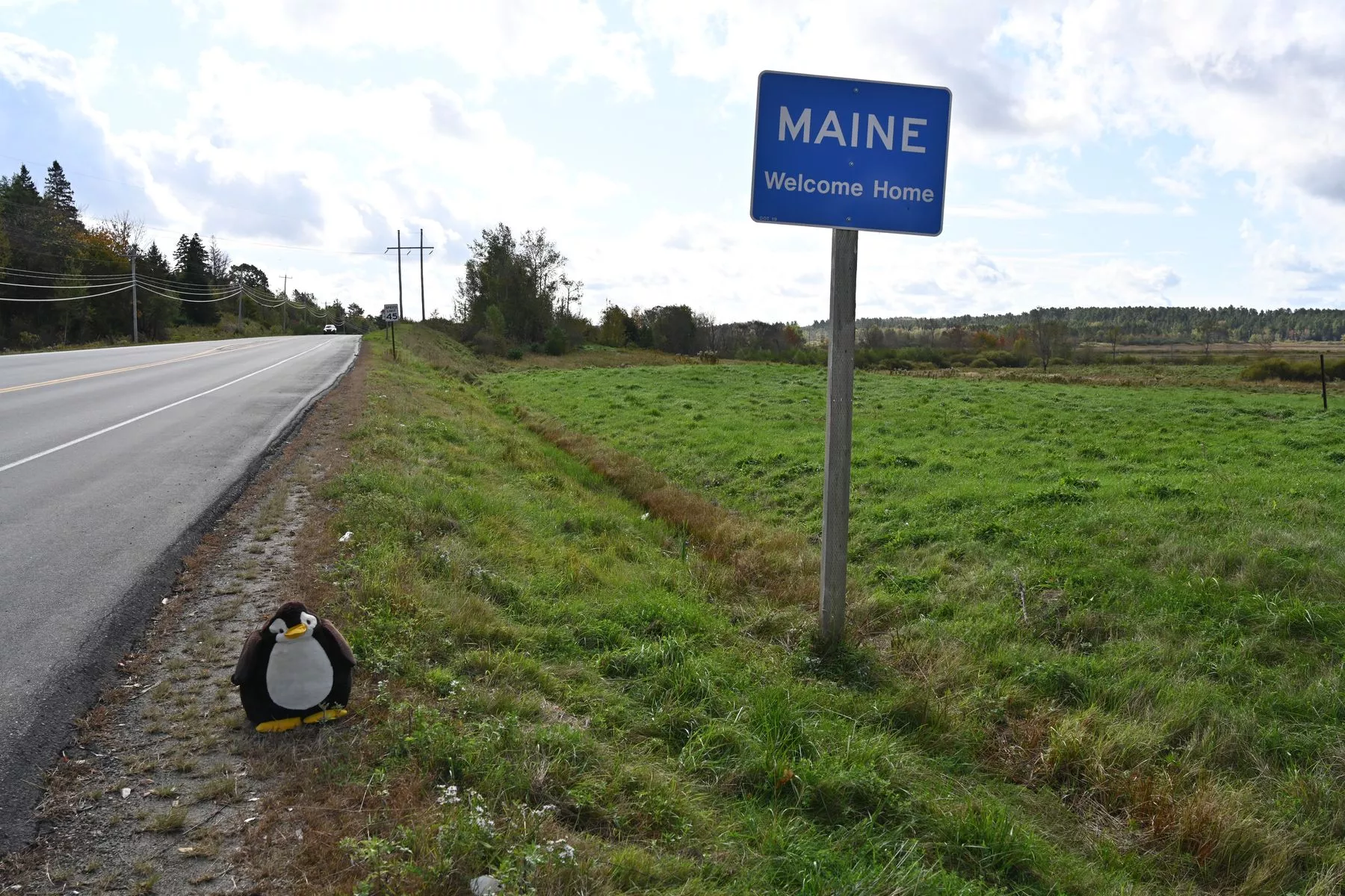 Die Einreise in die USA war wieder absolut problemlos. Gleich hinter der Grenze trafen wir am Maine-Schild ein Pärchen aus Illinois, die sich freuten, mit Maine nun ihren 50. Bundesstaat besucht zu haben. Wir machten ein Foto von ihnen und ihrem mitgebrachten Jubiläumsschild "50". Und dann setzte sich der Herr noch eine selbstgestrickte Minion-Mütze auf, um für ein Foto zu posieren. Das würde er wohl immer so machen. Irgendwie drollig. Der eine so und der andere schleppt einen schweren Stoffpinguin mit sich herum ;)