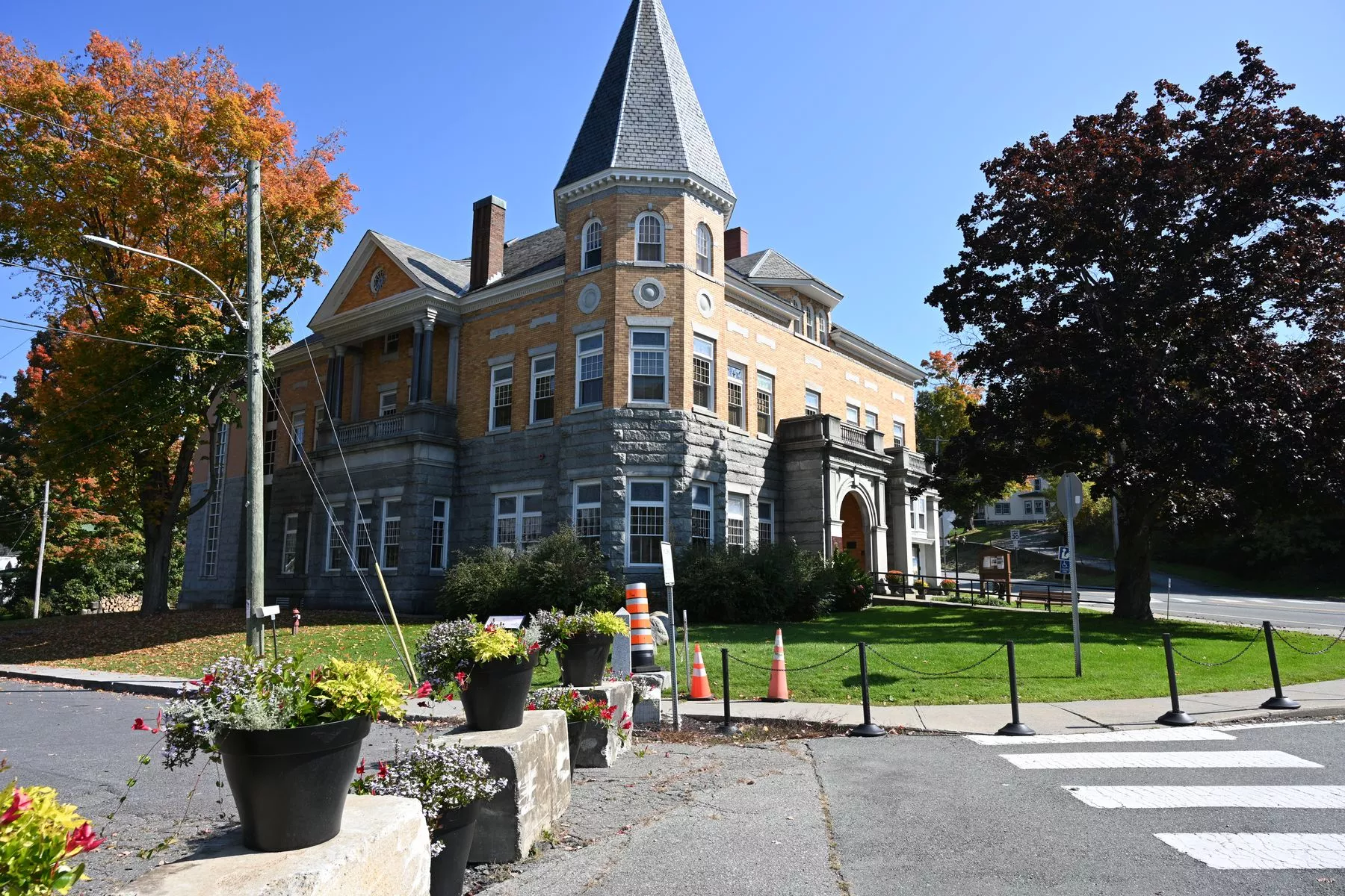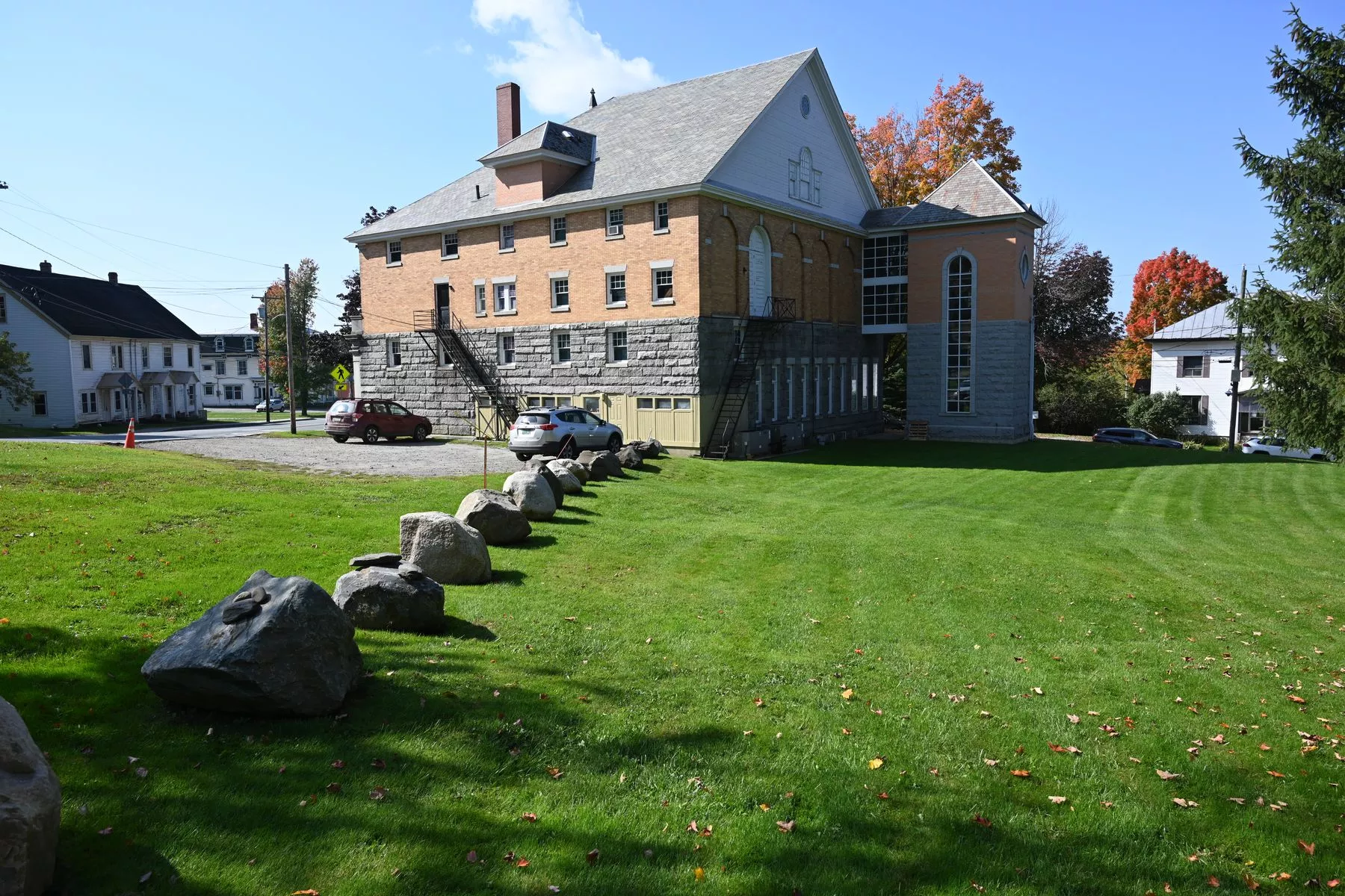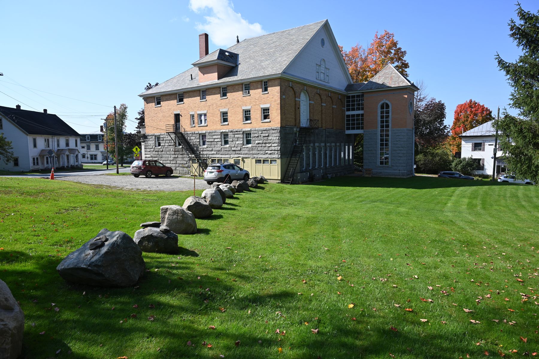 Dann kam Derby Line. Hier seht ihr ein Gebäude, dass sich mitten auf der Staatsgrenze von Kanada und der USA befindet. Leider war Sonntag und es hatte geschlossen. Kanada befindet sich links neben den Steinen und ich stehe nun auf der US-amerikanischen Seite. Ein Übertritt der Grenze streng verboten. Allerdings darf man, wenn das Gebäude geöffnet ist, von der kanadischen Seite aus mit Genehmigung in das Haus. Dafür geht man also von Kanada aus an dem rot-weißen Poller vorbei und darf man den Bürgersteig bis zum Haus nicht verlassen. Für den Rückweg nach Kanada gilt das genauso.