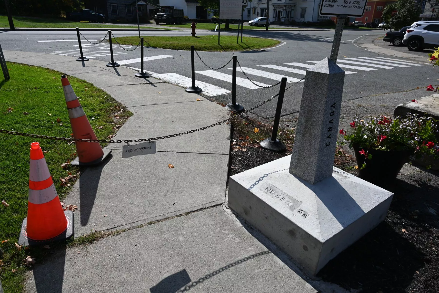 Auf der anderen Seite des Hauses ist die Grenze mit diesen Findlingen markiert. Ich stehe hier auf kanadischer Seite und die Autos in den USA.