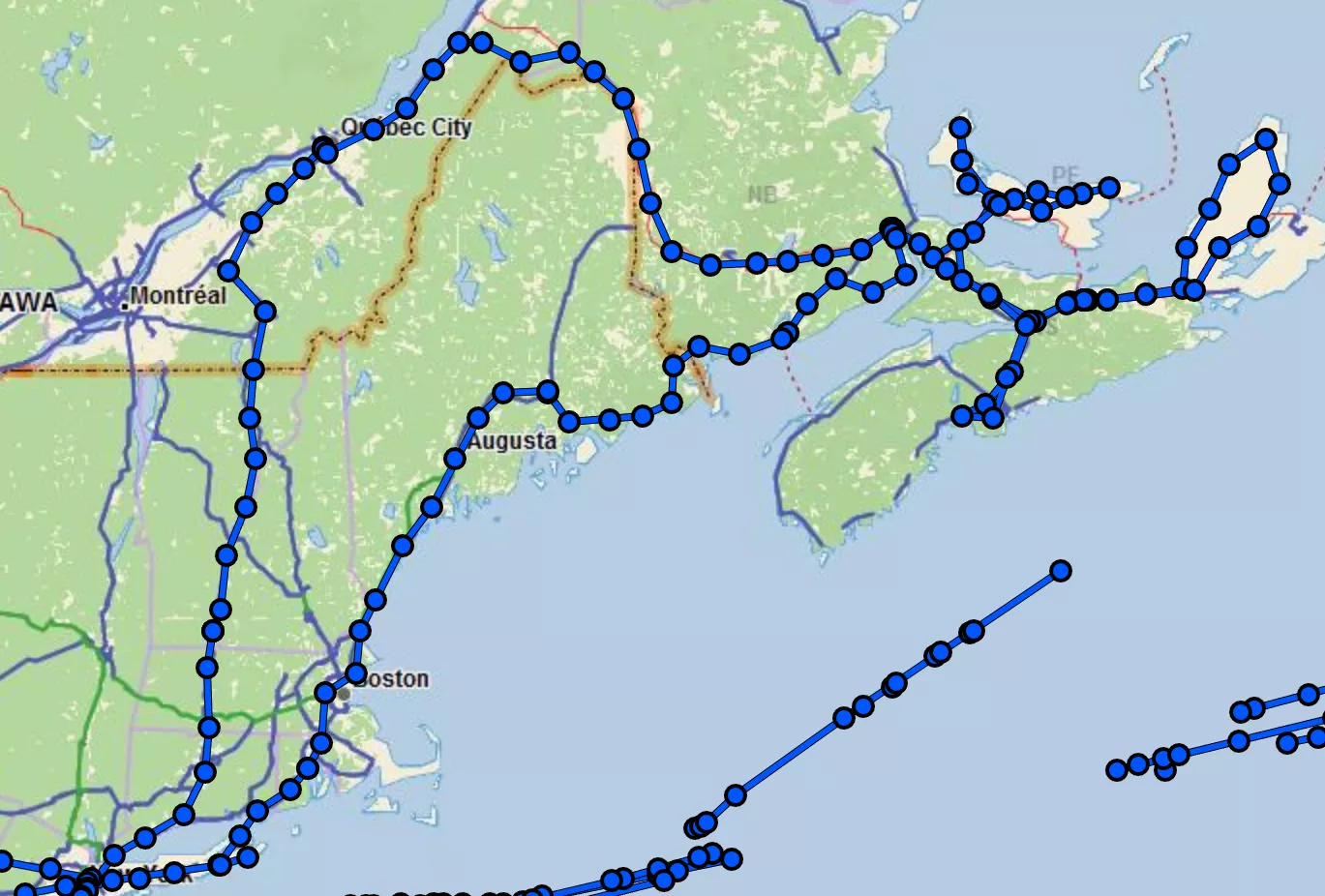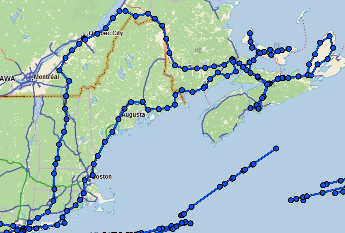 Dort verläuft die Reise durch Québec, New Brunswick, Prince Edward Island, Nova Scotia und wieder New Brunswick zurück in die USA nach Maine. Es folgen noch New Hampshire, Rhode Island und Long Island im Staat New York.