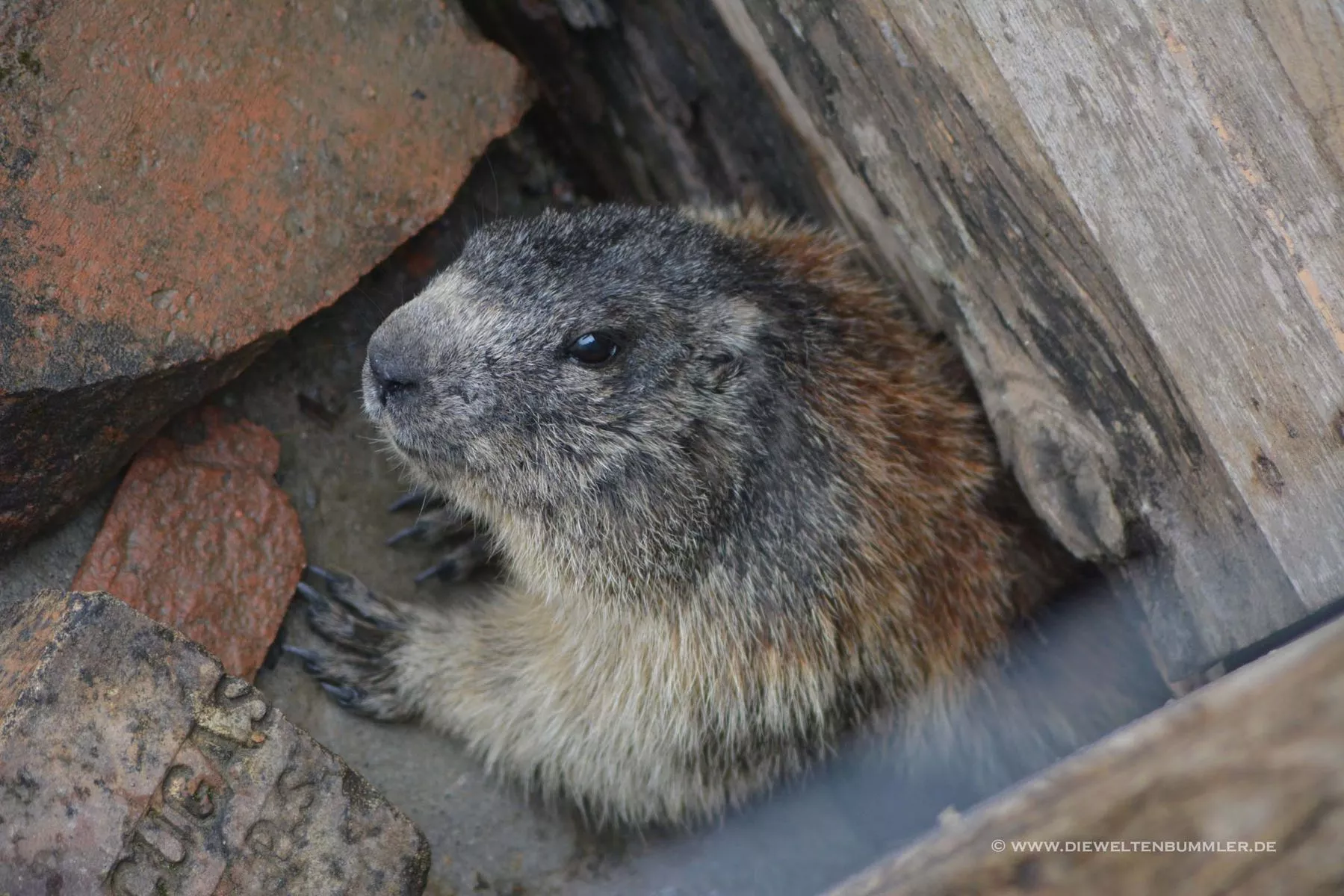Murmeltier. Oben auf dem Stilfser Joch hat es sich ein wenig versteckt.