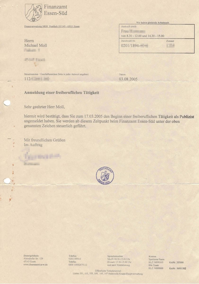Hat jetzt nur bedingt mit Reisen zu tun, doch es gibt ein Schreiben vom Finanzamt, das ich bis heute sehr gerne aufbewahrt habe und das ein wenig der Grundstein für das alles ist, was ich mache, also auch inklusive Forum. Morgen vor 20 Jahren startete nämlich meine Karriere als Publizist. Hauptberuflich wohlgemerkt. Nebenberuflich habe ich das schon zuvor gemacht. Mein erstes Buch erschien bereits im März 2004. Den Buchvertrag dafür unterschrieb ich sogar im Herbst 2002.
