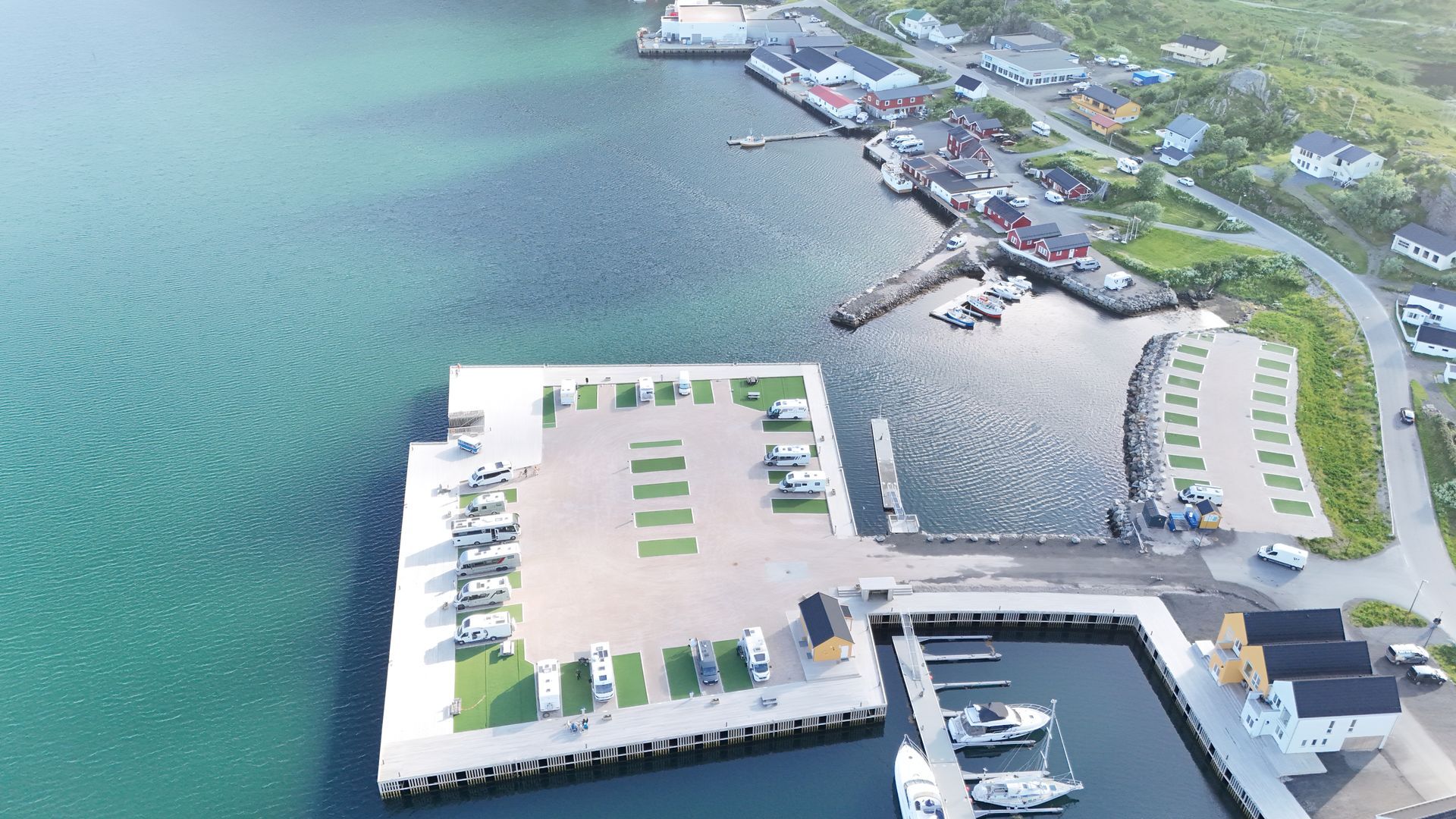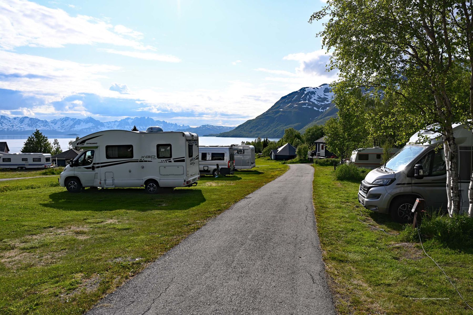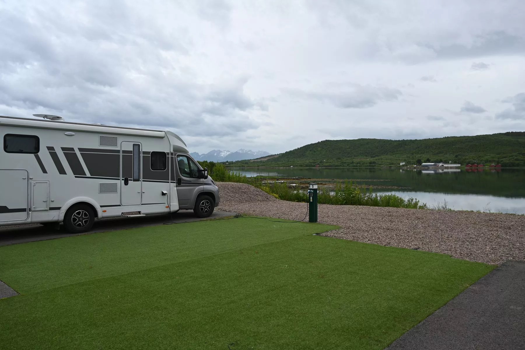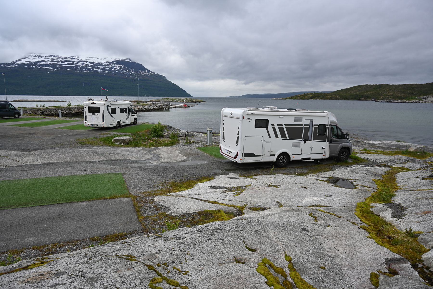 Einen ziemlich schicken Stellplatz fanden wir am nächsten Abend in Innhavet. Direkt auf den Schären steht man hier und hat man ein paar Flächen hergestellt. Weil dort oben das Gras natürlich nicht so üppig wächst wie bei uns, arbeitet man dort mit Kunstrasen. Auf den ersten Blick irgendwie seltsam, aber wir haben das später auch auf anderen Plätzen gesehen und fanden das dann irgendwie nett. Ist halt ein Farbtupfer und sieht natürlich gepflegt aus: