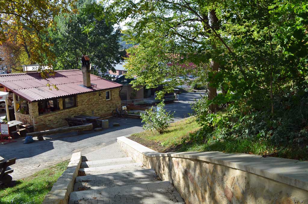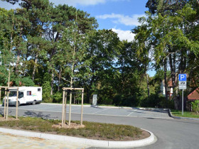 Neben der Zufahrt zu diesem Kiosk erreicht man einen Busparkplatz, auf dem noch sechs weitere Stellplätze zum Übernachten einladen. Hier erhält man 2 Stunden Strom bei Einwurf einer 1-Euromünze. Die Übernachtung bezahlt man am Parkscheinautomaten. Die beiden Plätze sind zwar recht innerstädtisch, dafür aber relativ ruhig. Zu Fuß sind die beiden Anlagen über eine Treppe miteinander verbunden.