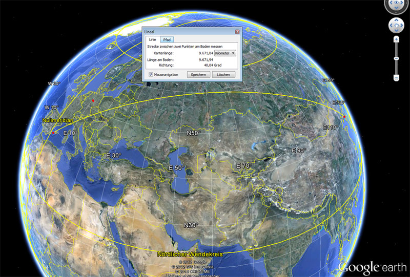 Ich habe bei der Erstellung des Rätsels die Gradangaben genutzt, die mir Google Earth zwischen Punkt A und Punkt B genannt hat. Doch wie kann man auf einer Papierkarte diese beiden Punkte mit der selben Gradzahl verbinden?