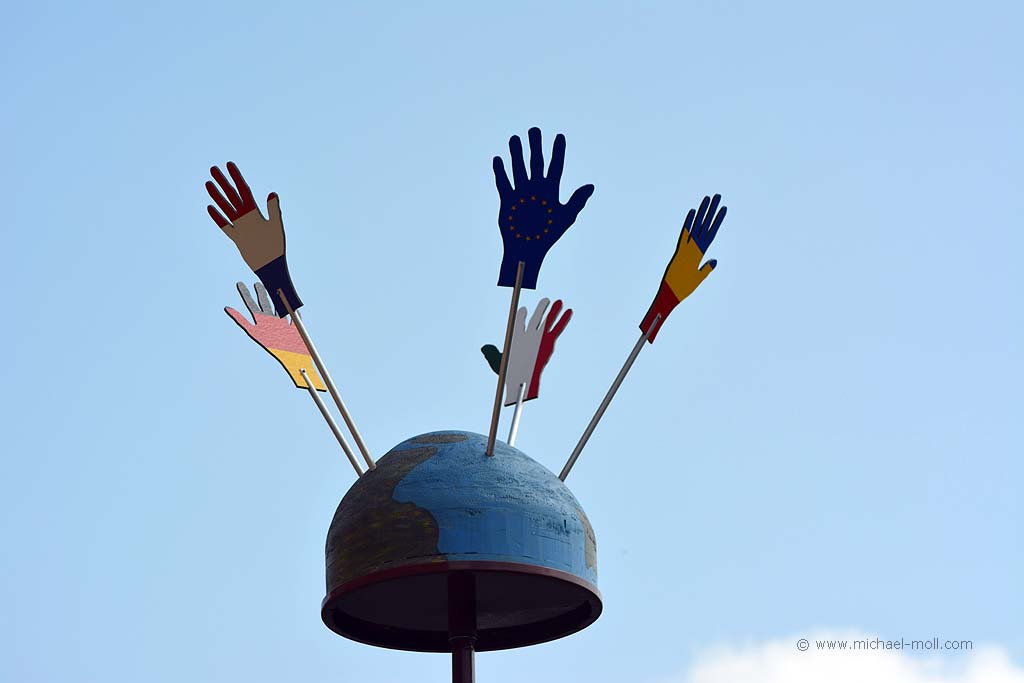 Auf der Straße gibt es mehrere Kreisverkehre. An einem erhebt sich dieses Denkmal mit der Inschrift "Alle Menschen werden Brüder"