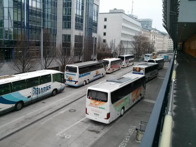 Draußen vor der Station stehen einige Busse herum, die auf ihren nächsten Einsatz warten. Es sind hauptsächlich ausländische Busse aus Serbien, Kroatien, Polen, dem Baltikum usw, die wahrscheinlich früh morgens hier angekommen sind und am Abend wieder über Nacht in die Heimat zurückfahren werden.