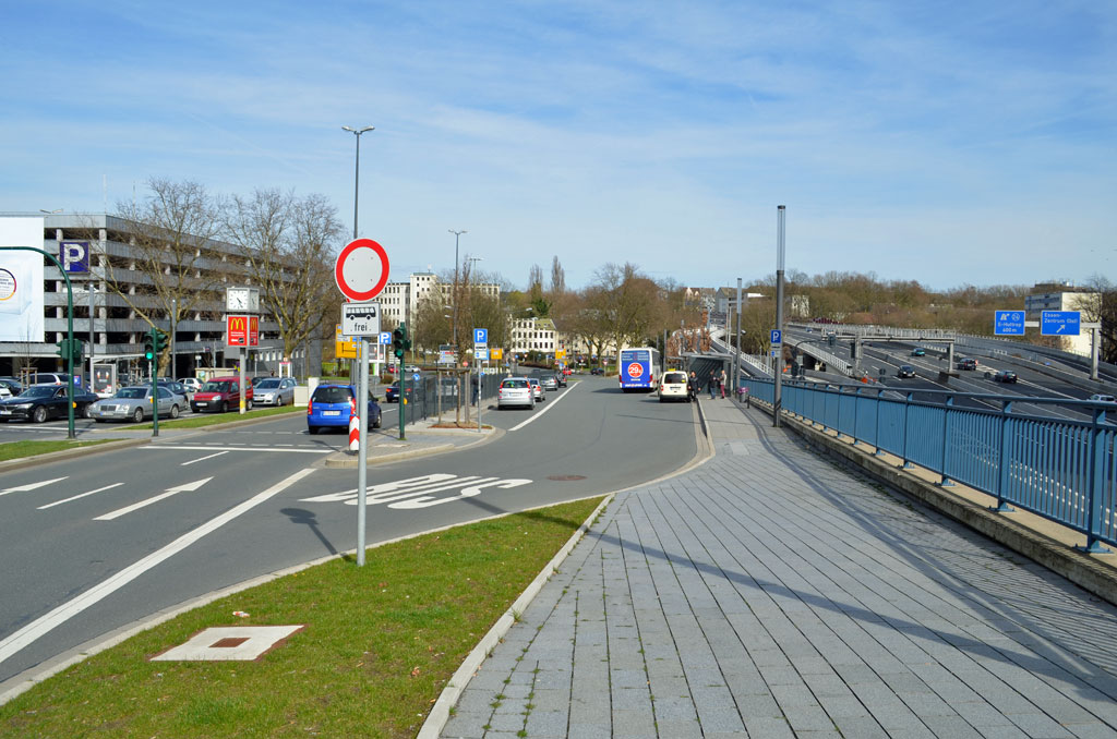 Und nun der Blick in die andere Richtung. Nun ist der Hauptbahnhof links, zu sehen ist auf der linken Seite ein Parkhaus vom Hbf. Rechts die Autobahn, das ist die A40, die hier gerade in einem Tunnel verschwindet. Wie man sehen kann, befinde ich mich an der Einfahrt des Busbahnhofs.