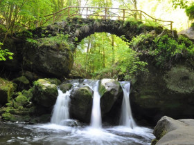 Dieser ist 110 Kilometer lang und verläuft in drei großen Schleifen im östlichen Luxemburg, nahe der deutschen Grenze. Zahlreiche Felsformationen aus Sandstein prägen den waldreichen Pfad, aber der landschaftliche Höhepunkt ist der Wasserfall "Schießentümpel". Dabei ist der Begriff "Wasserfall" schon beinahe übertrieben, denn tief fällt das Wasser der Schwarzen Ernz nicht hinab. Aber die drei Kaskaden unter einer malerischen Holzbrücke sehen trotzdem toll aus.