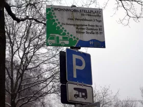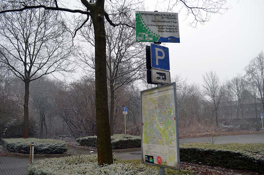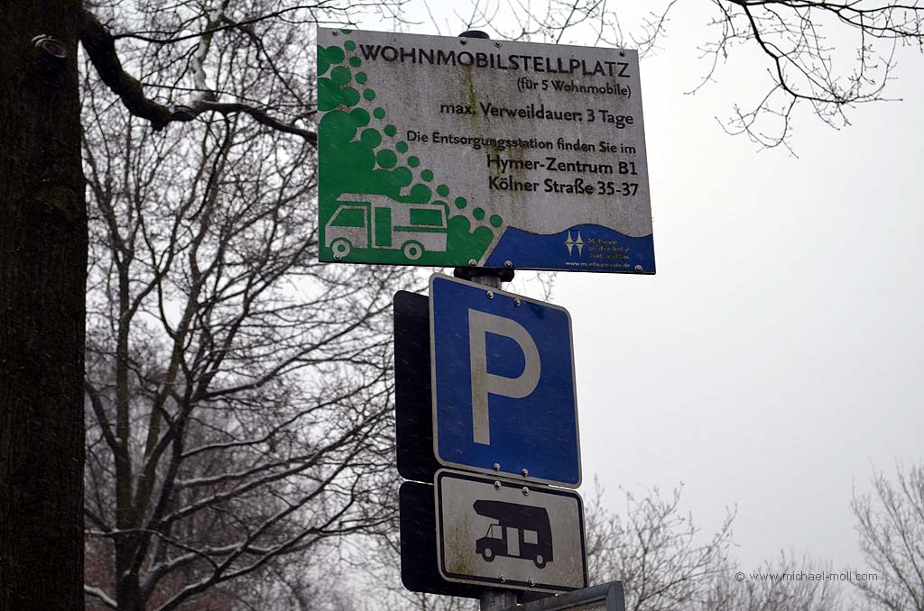 Drei Nächte darf man dort stehen, eine Ver- und Entsorgungsstation existiert dort zwar nicht, doch in der Nähe (rund 3 Minuten mit dem Auto) ist das Hymer-Zentrum auf der Kölner Straße. Die Kölner Straße ist ohnehin bekannt für seine zahlreichen Wohnmobil-Händler. Obwohl diese "Camping-Meile" in den letzten Jahren stark nachgelassen hat.