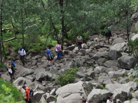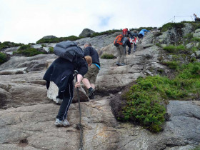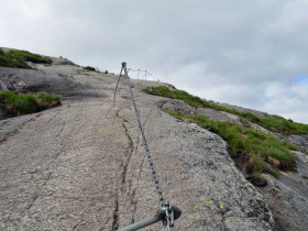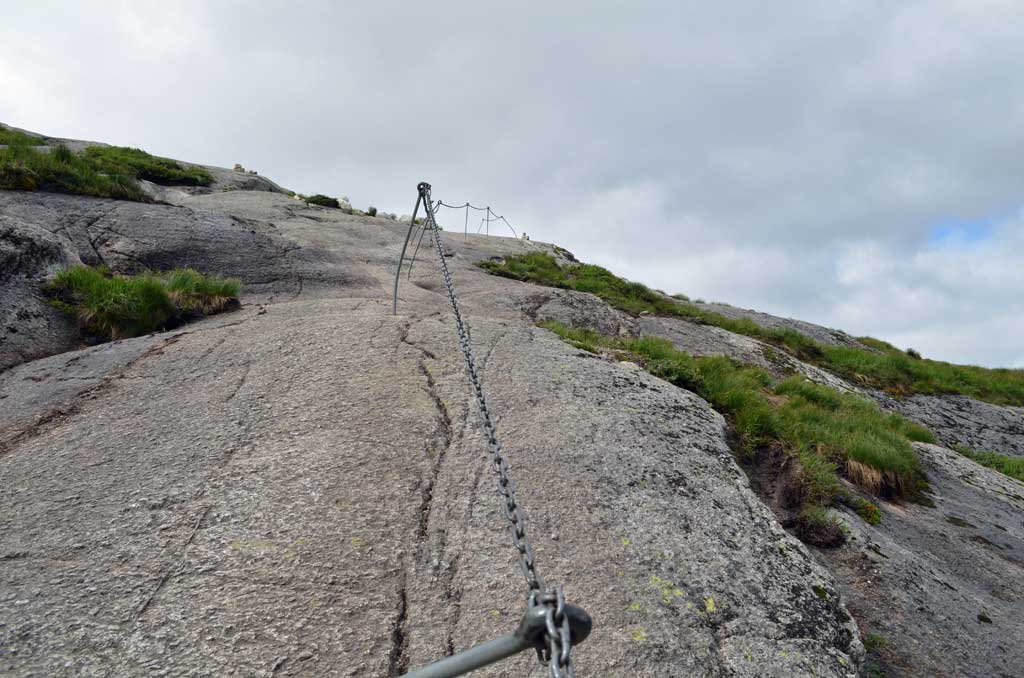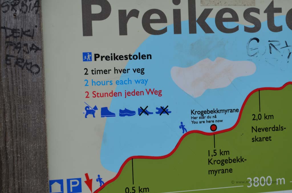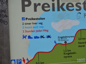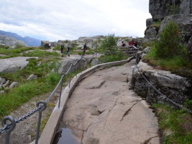 Der Wanderparkplatz kostet 100 Kronen (also rund 13 Euro), weshalb ich etwas weiter unterhalb auf einem kostenlosen Schotterparkplatz geparkt hatte. Dadurch muss man auf der Serpentinenstraße noch ein paar Höhenmeter mehr überwinden. Der eigentliche Weg geht dann über das Kjeragmassiv zunächst recht steil aufwärts. Einige fest installierte Ketten dienen als eine Art Handlauf. Oben angekommen geht es wieder hinab, nur um wenig später hinauf wandern zu müssen. Dieses Mal ohne Handlauf, trotzdem muss man die Hände benutzen, um sich an dem einen oder anderen Felsen hochzuziehen. Nach diesem zweiten Aufstieg geht es - natürlich hinab. Der dritte Aufstieg zieht sich ein wenig, doch dafür geht man dann oberhalb des Lysefjords gerade auf dem Kjeragmassiv entlang.