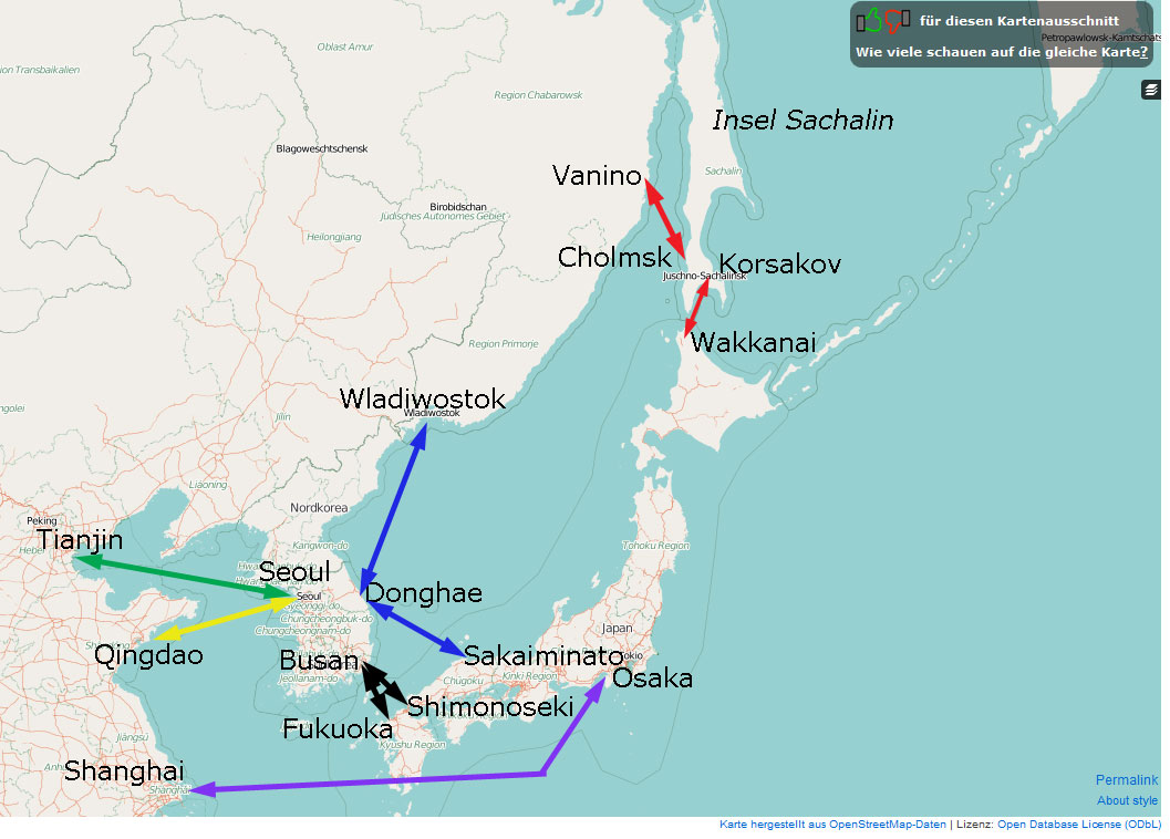2. Deutlich leichter dürfte es von russischer Seite aus, ab Wladiwostok, gehen (blaue Pfeile). Eine Fähre pendelt einmal die Woche ab Russland nach Donghae in Korea und weiter nach Sakaiminato in Japan.