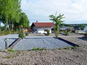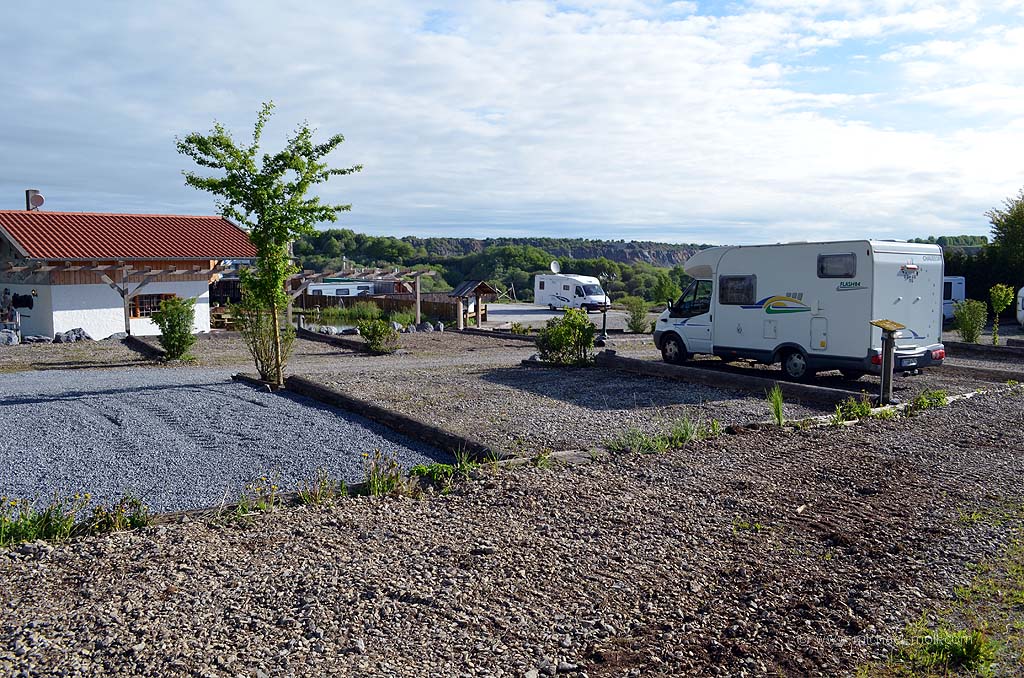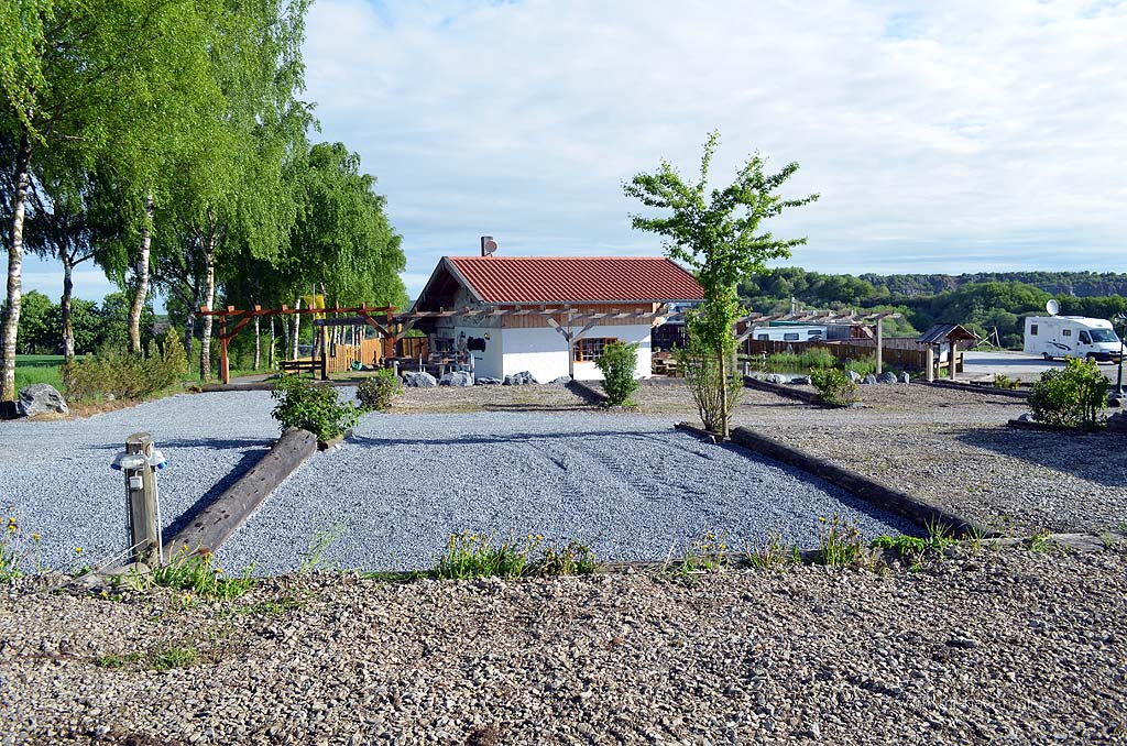 Auf dem war ebenfalls nichts los. Nur ein niederländisches Wohnmobil stand dort ganz einsam. Die Plätze sind aber nett in Parzellen angelegt und zum Stellplatz gehört noch das rustikale Restaurant "Zum Bayernstadl". Aber auch dort war niemand. Alles war abgeschlossen außer die Toiletten, die über eine Außentreppe in der ersten Etage zu erreichen sind. Später kam noch ein schwedisches Wohnmobil hinzu.