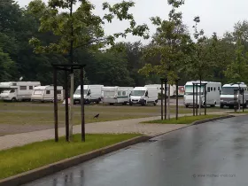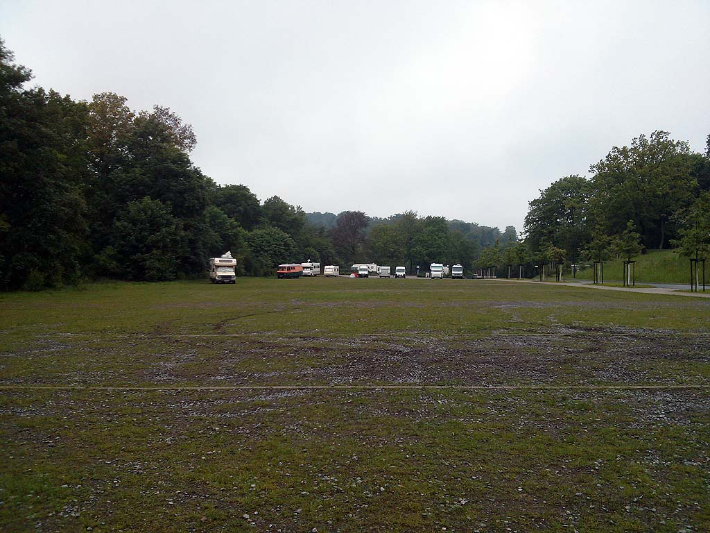 Auf beiden Bilder ist der eigentliche Platz jedoch gar nicht zu sehen, denn dieser ist von einer Hecke umgeben und befindet sich hinter der Wohnmobilreihe auf dem zweiten Foto. Das Wohnmobil, das im Hintergrund quer steht, befindet sich in einer der Parzellen. Eigentlich ist der Platz nur für zehn Wohnmobile ausgelegt, aber wie man sieht, befinden sich rundherum große Parkplätze, die auch genutzt werden. Und ja, auch von Wohnwagen und Zelttouristen - zumindest gestern.