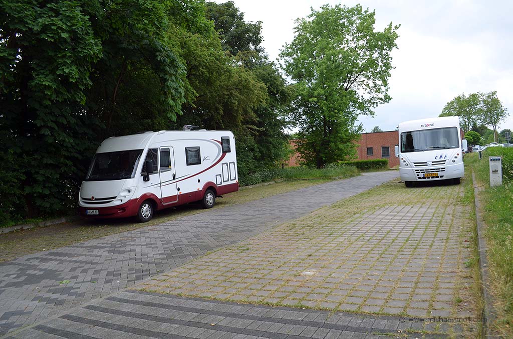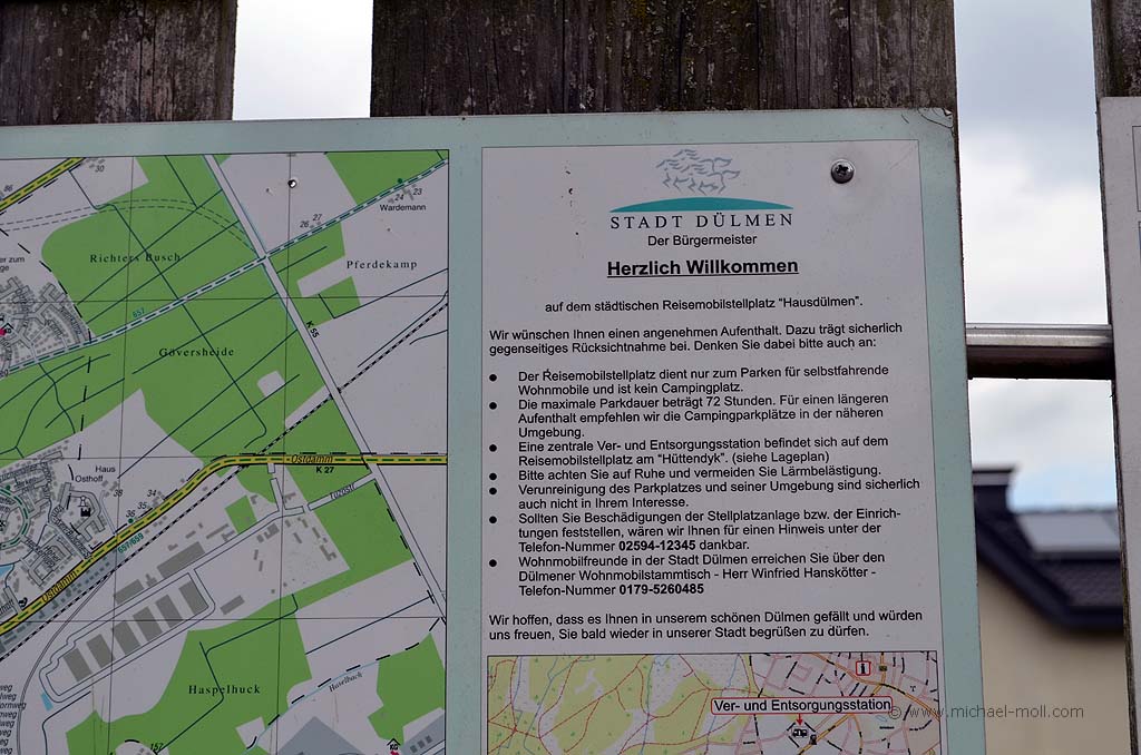 Die kleine Stadt Dülmen im südlichen Münsterland hat mich echt überrascht. Ganze vier Stellplätze verteilen sich auf das Stadtgebiet. Außerdem hält die Stadtverwaltung noch einen Flyer parat und an jedem Stellplatz befinden sich Informationen und ein Stadtplan, auf dem die anderen drei Stellplätze eingezeichnet sind. Kann ja sein, dass man sich erst einmal die anderen anschauen möchte, weil einem genau der, auf dem man gerade steht, nicht gefällt.