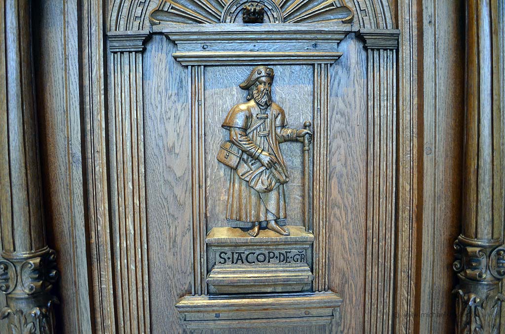 Holzgeschnitzte Apostel wie Jakob der Ältere sind an der Wand zu sehen.
