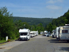 Direkt an der Rur gelegen, befindet sich der Wohnmobilstellplatz von Heimbach. Ich mache die Aufnahme gerade genau an der Einfahrt. Links vorne sieht man die Entsorgungsmöglichkeit. Was man hier nicht sieht, aber auf der Karte, ist die Bahnlinie, die direkt neben dem Stellplatz entlang führt.