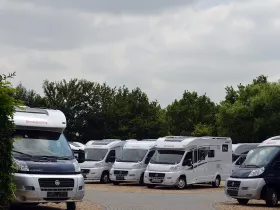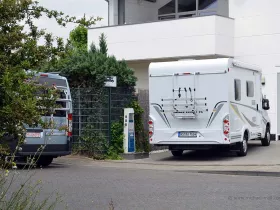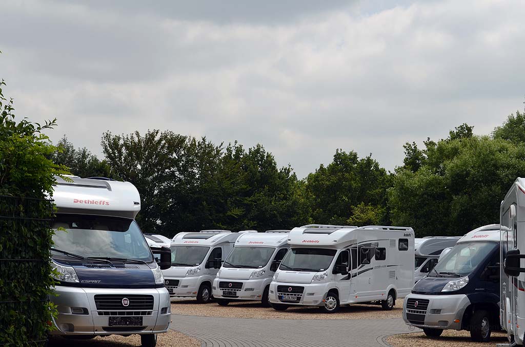 In Hückelhoven befindet sich der Wohnmobilstellplatz mitten in einem Gewerbegebiet, denn er gehört zum Freizeitcenter Adolph. Dieses ist wiederum Vertragshändler von Dethleffs und Sunlight.