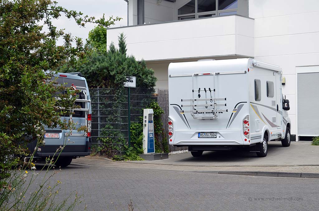 Die Einfahrt befindet sich dementsprechend in einer Art Hinterhof neben einer Waschanlage. Während es rechts zur Waschanlage geht, kommt man links zum Stellplatz und kann dort neben Neuwagen parken. Eine Entsorgungsstation befindet sich aber direkt neben dem Gebäude, also vor dem eigentlichen Übernachtungsplatz.
